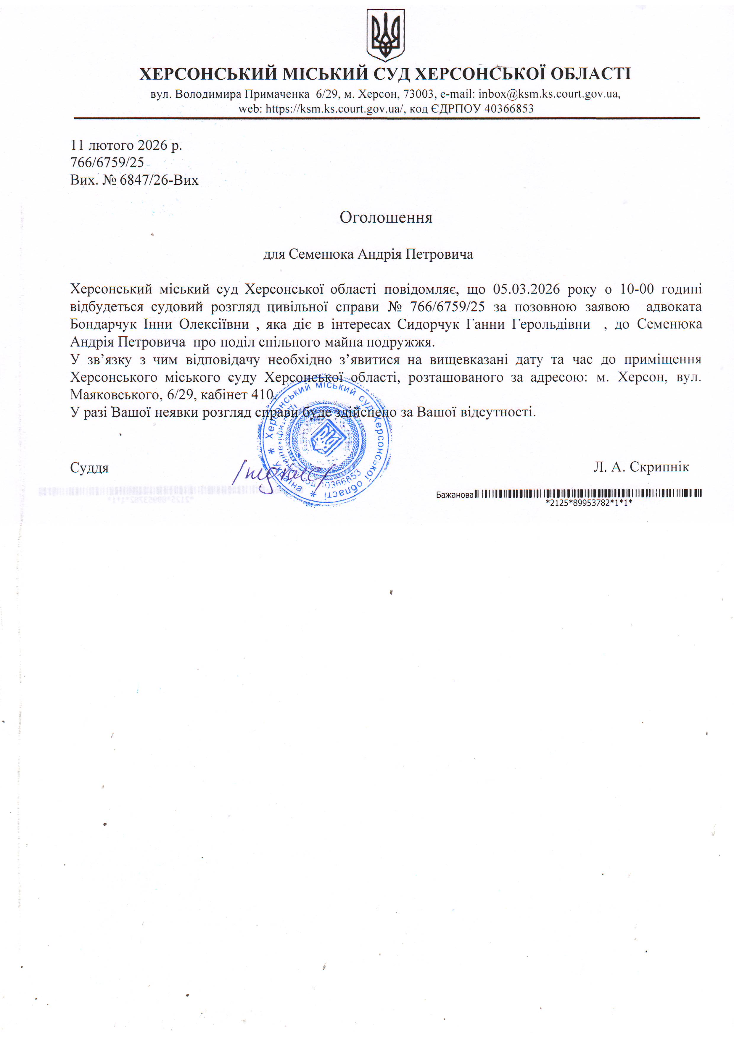Оголошення про виклик особи в суд та повідомлення про судове рішення