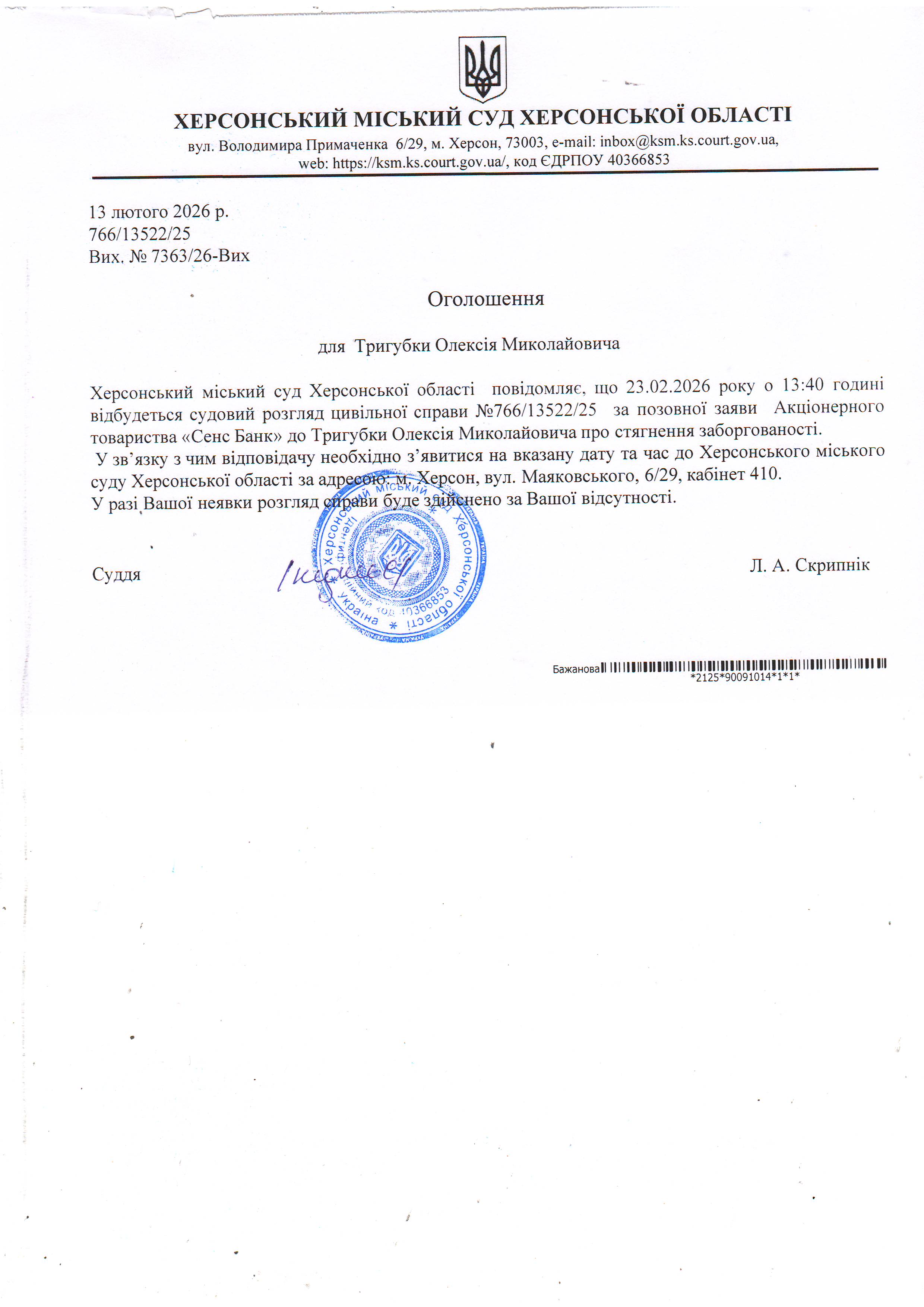 ОГОЛОШЕННЯ ПРО ВИКЛИК ДО СУДУ