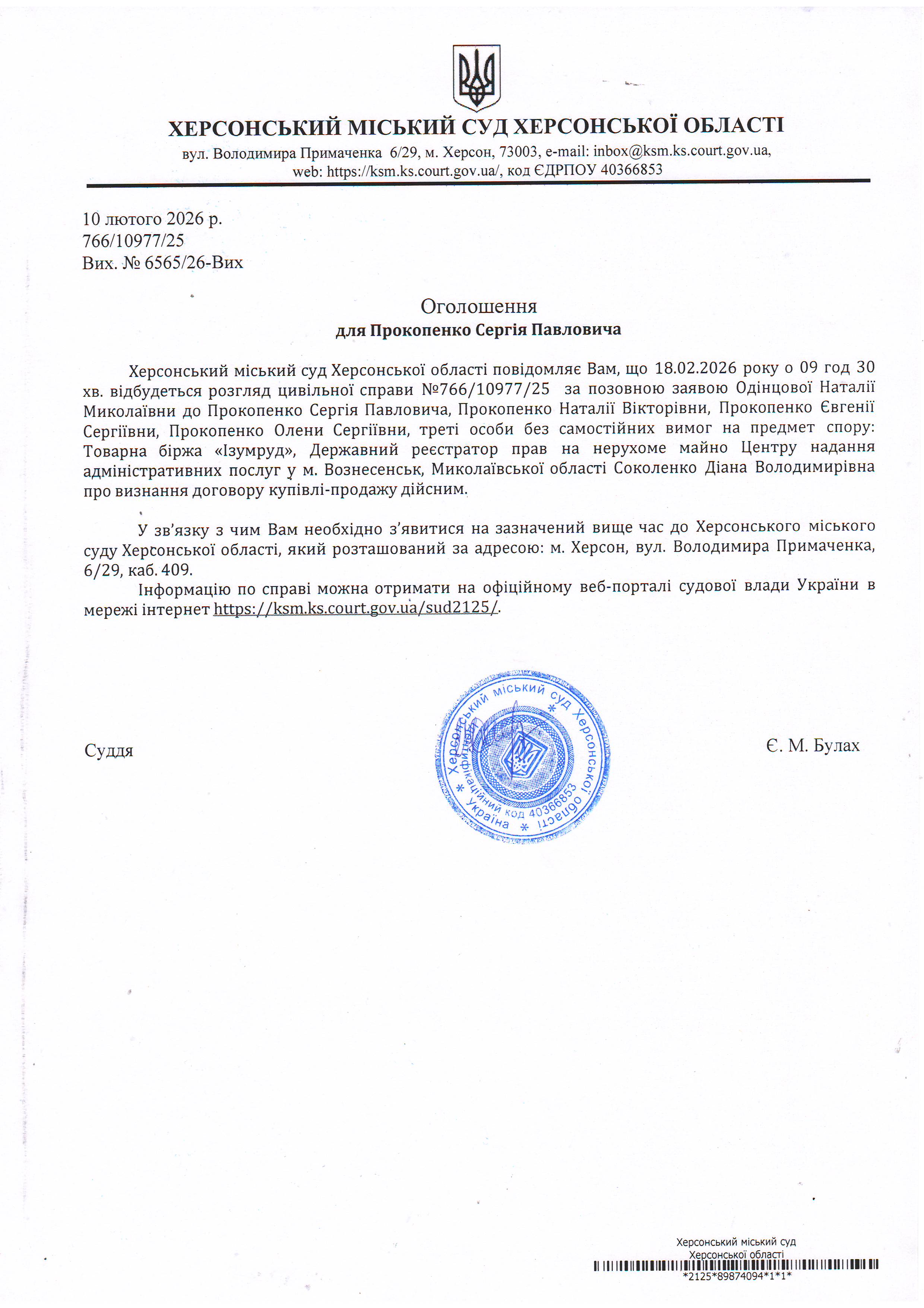 ОГОЛОШЕННЯ ПРО ВИКЛИК ДО СУДУ