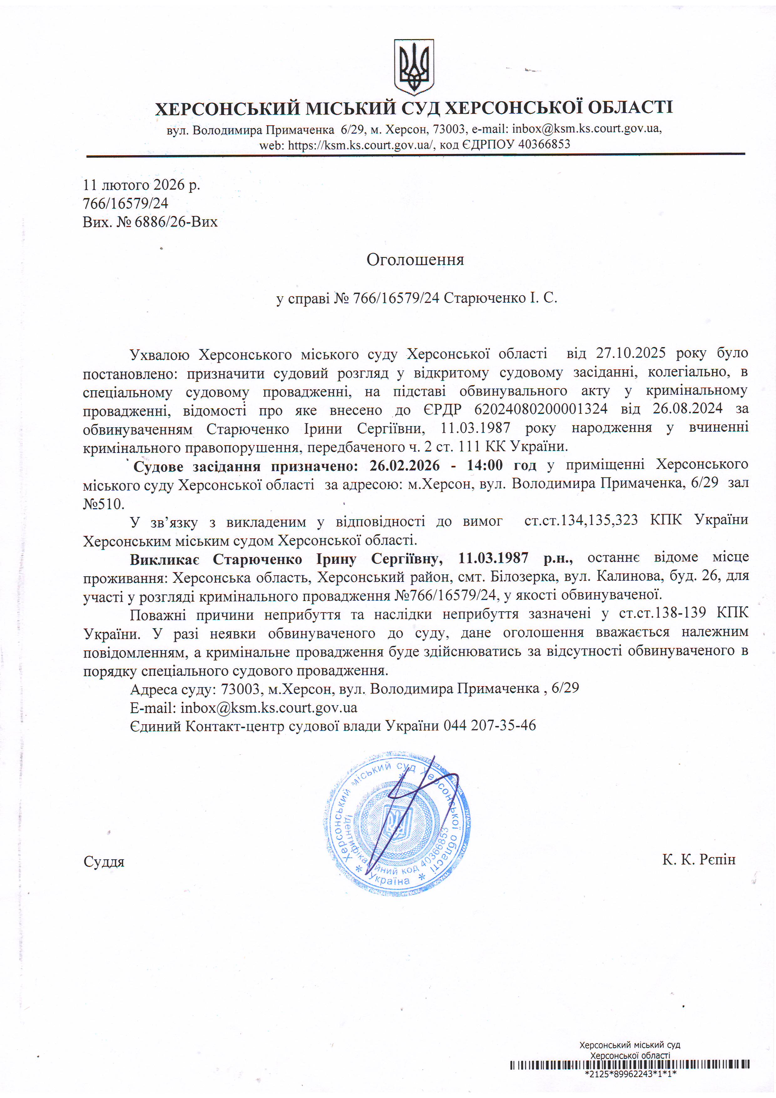 Оголошення для Старюченко Ірини Сергіївни