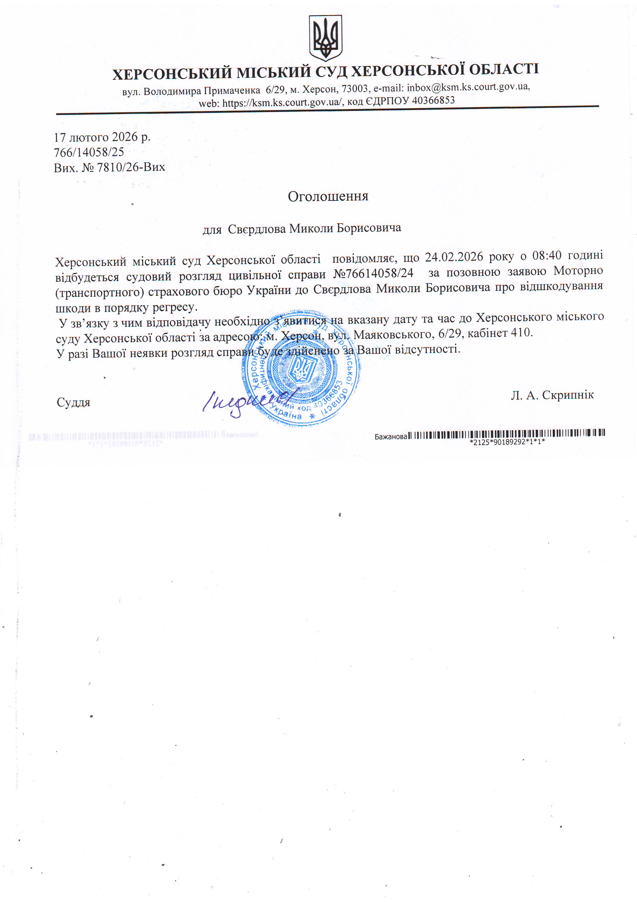 ОГОЛОШЕННЯ ПРО ВИКЛИК ДО СУДУ