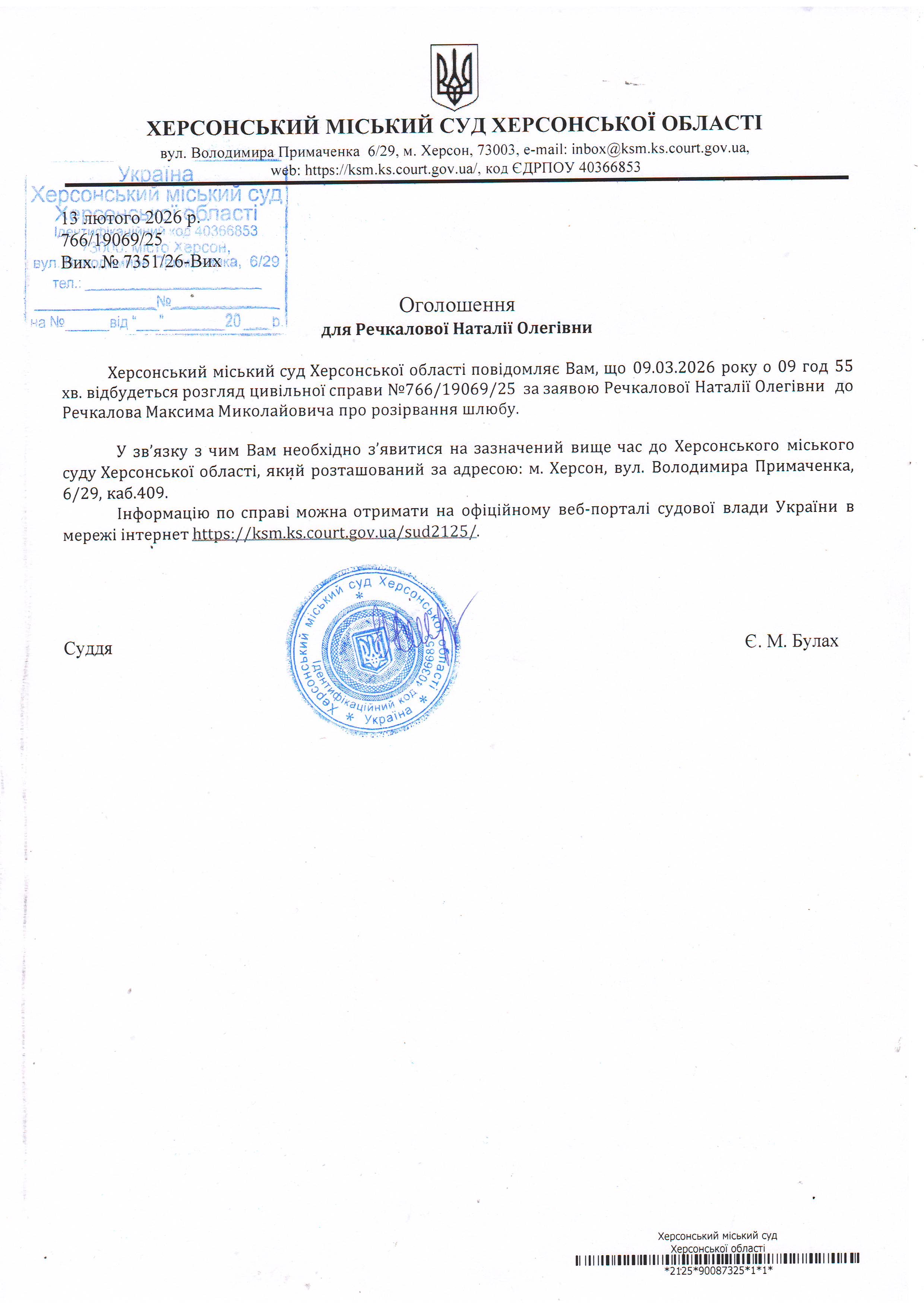 Оголошення для Речкалової Наталії Олегівни