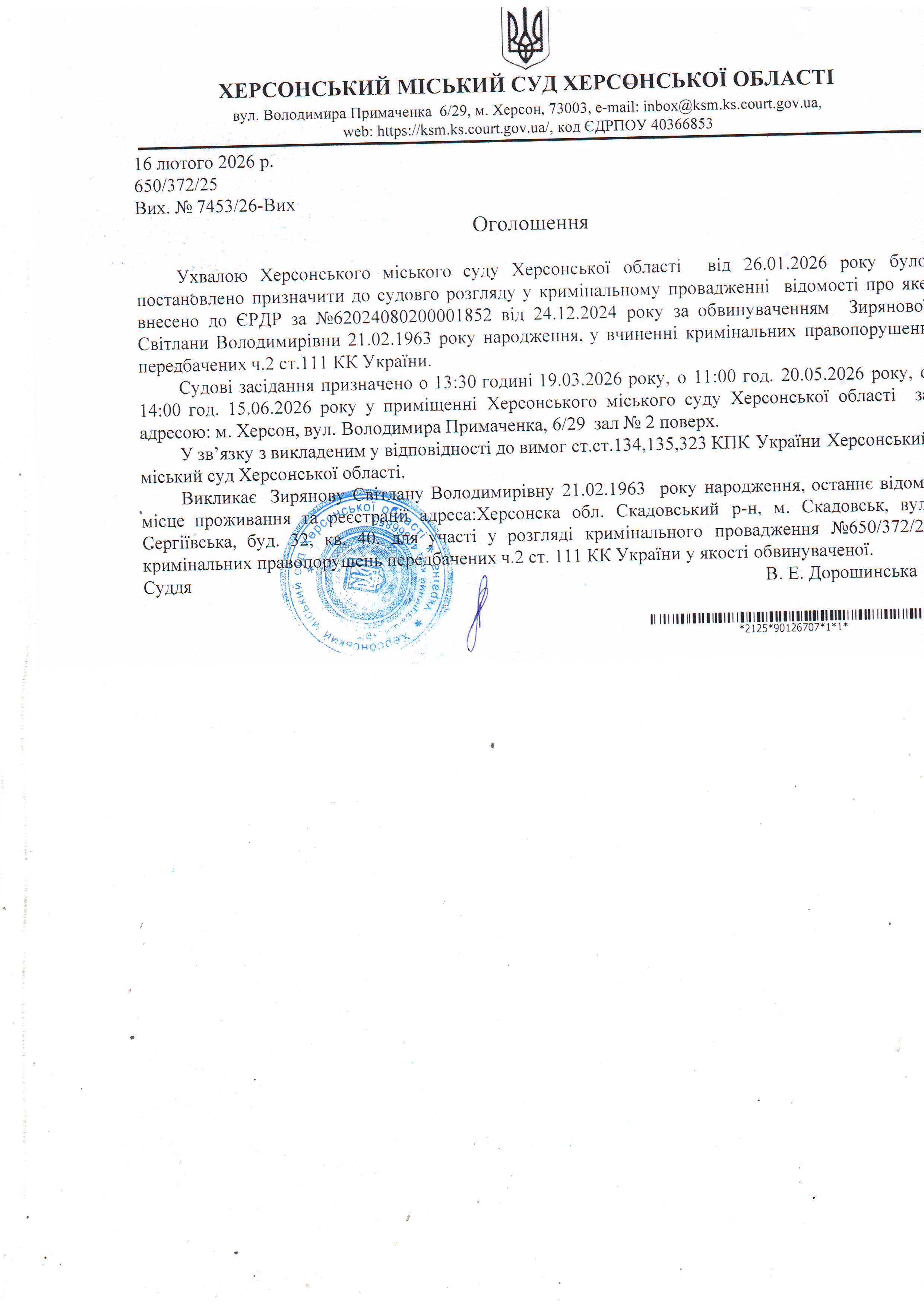Оголошення для Зирянової Світлани Володимирівни