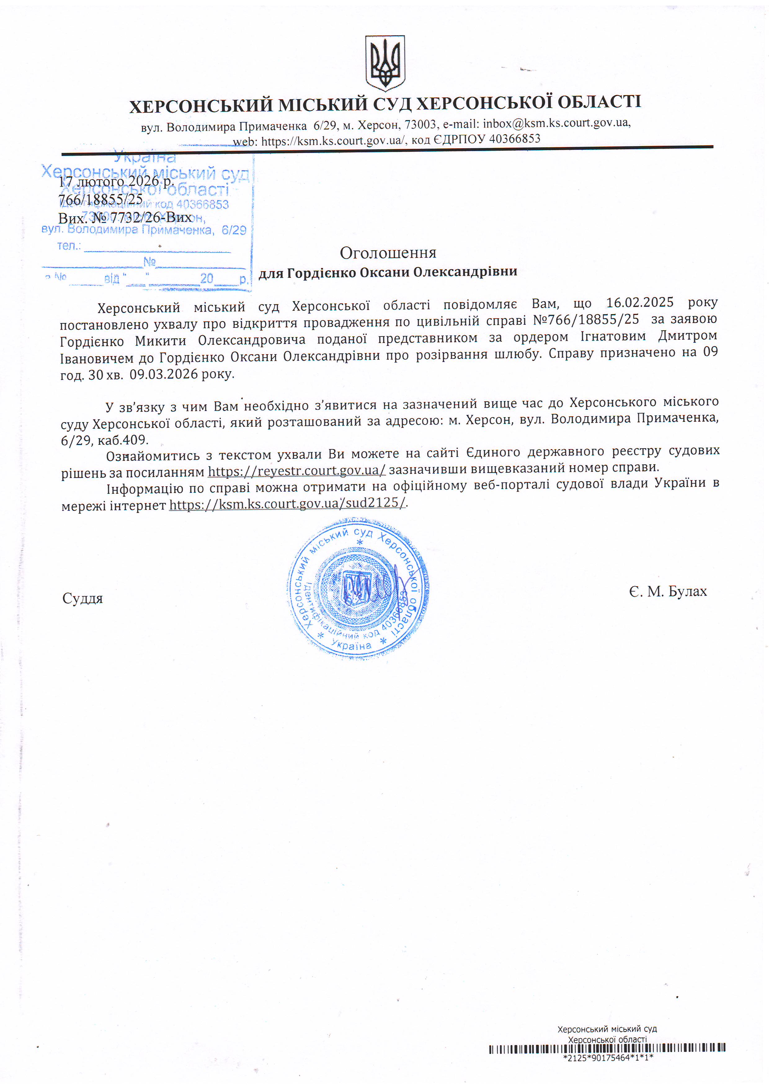Оголошення для Гордієнко Оксани Олександрівни