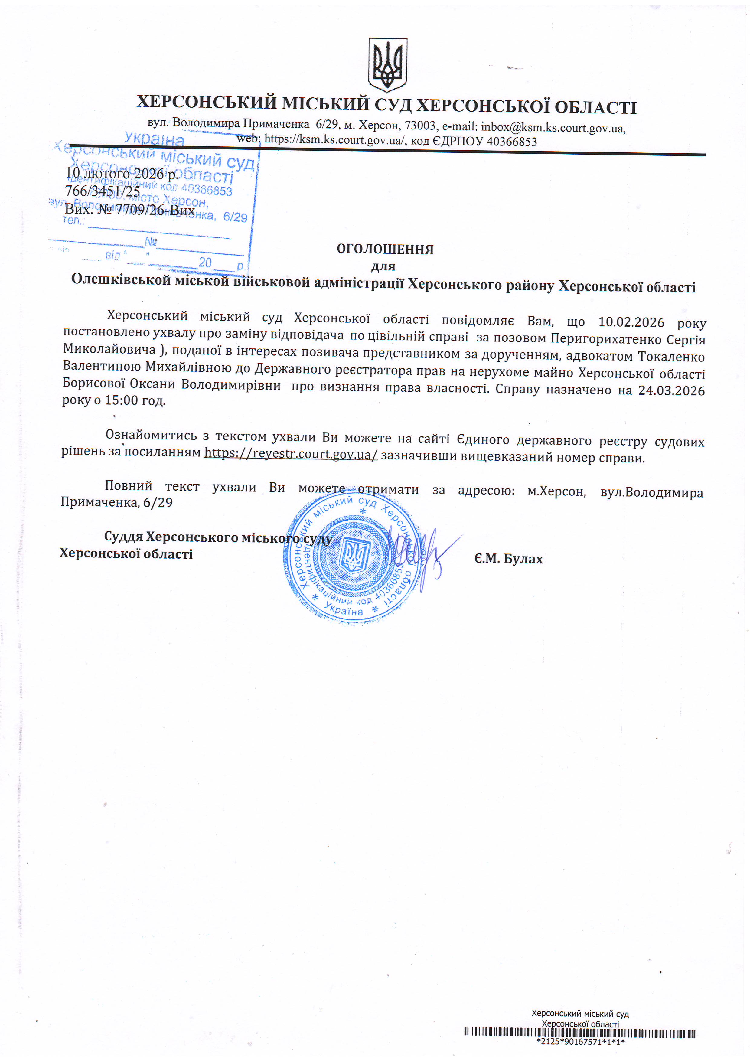 ОГОЛОШЕННЯ, УХВАЛИ ТА ЗАОЧНІ РІШЕННЯ