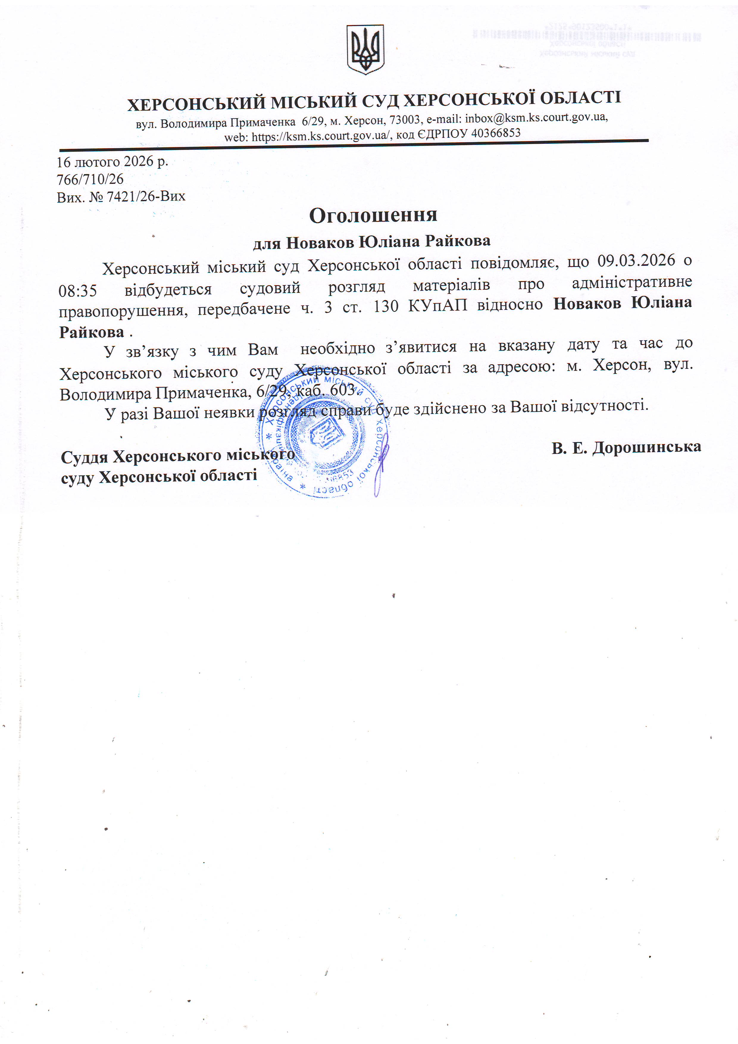 ОГОЛОШЕННЯ ПРО ВИКЛИК ДО СУДУ