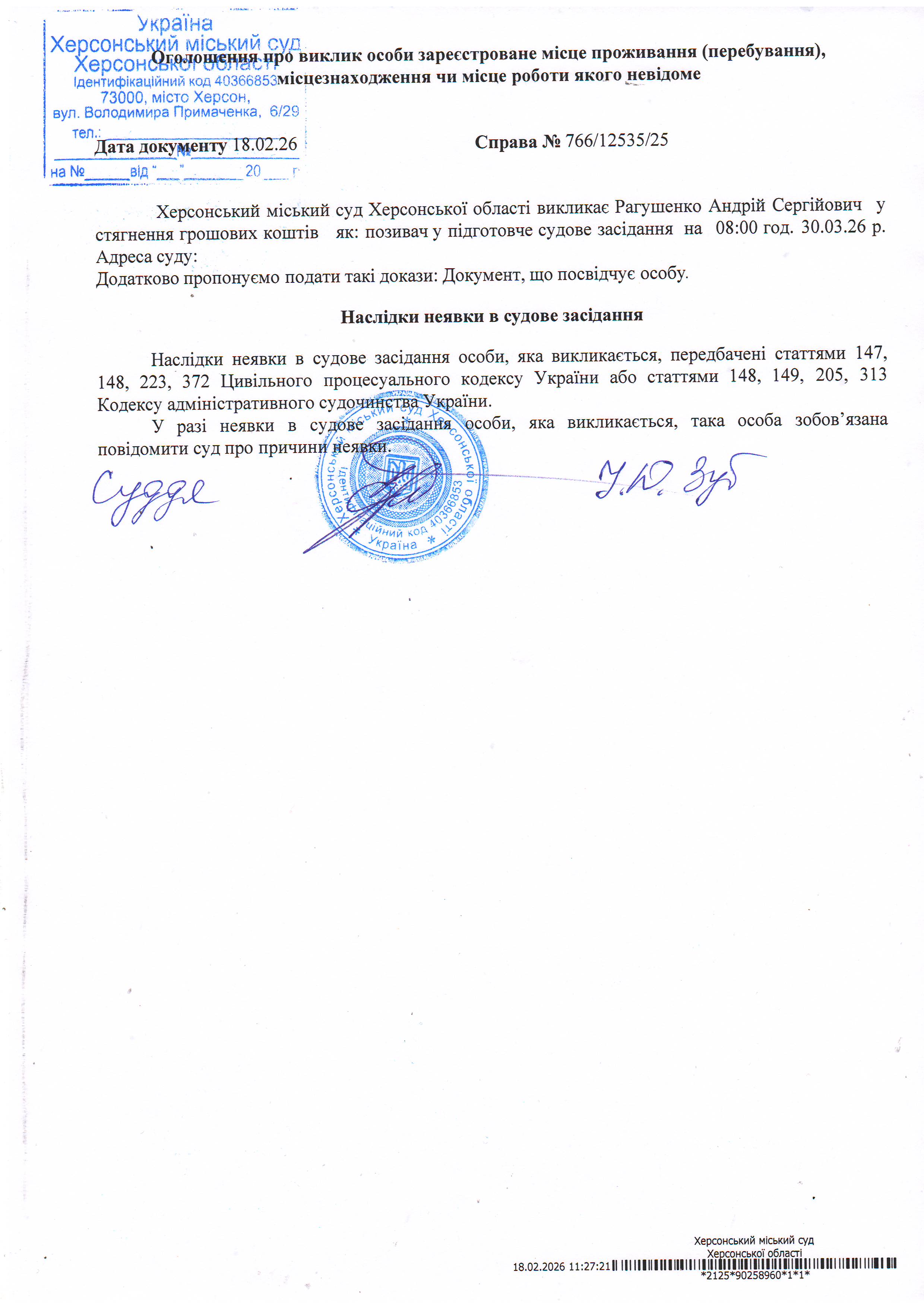 ОГОЛОШЕННЯ ПРО ВИКЛИК ДО СУДУ