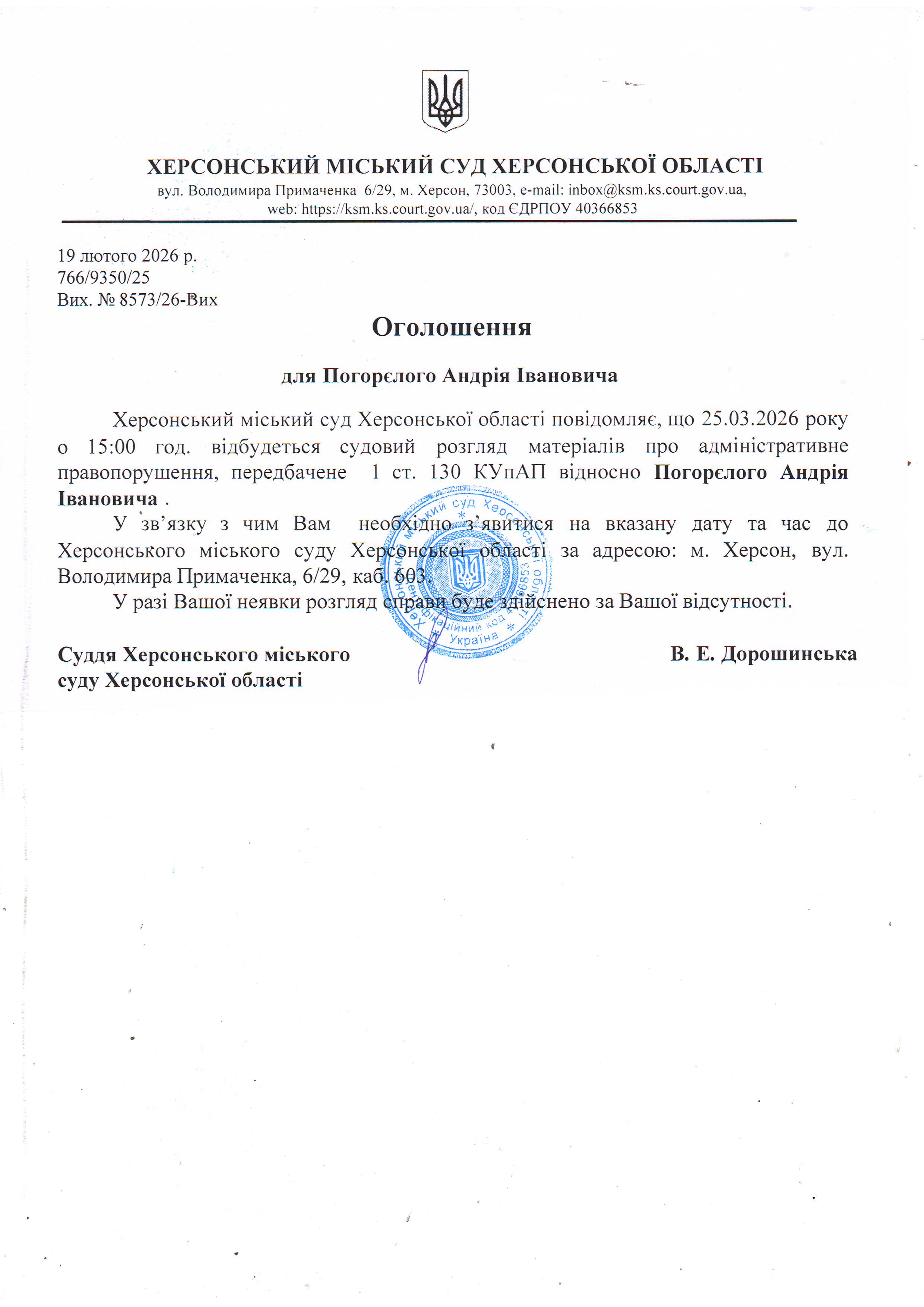 Оголошення для Погорєлого Андрія Івановича