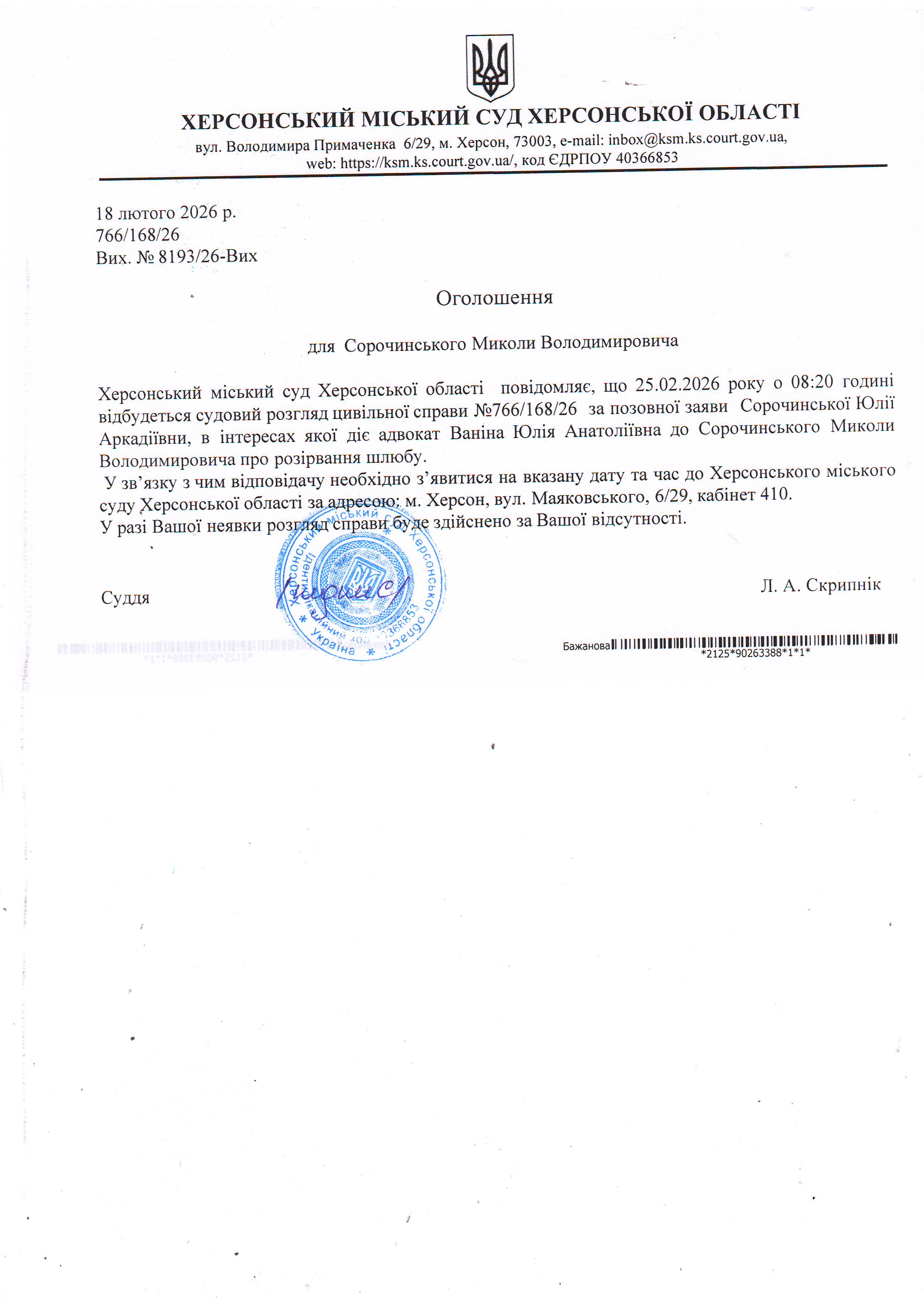 ОГОЛОШЕННЯ ПРО ВИКЛИК ДО СУДУ