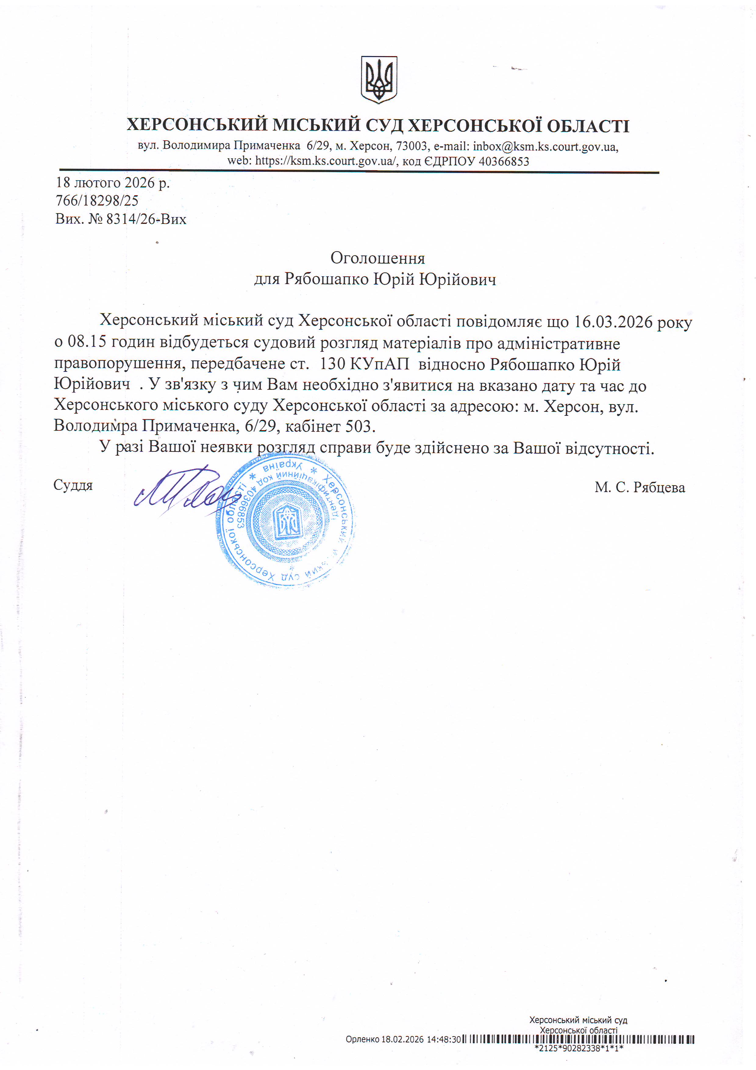 Оголошення для Рябошапка Юрія Юрійовича