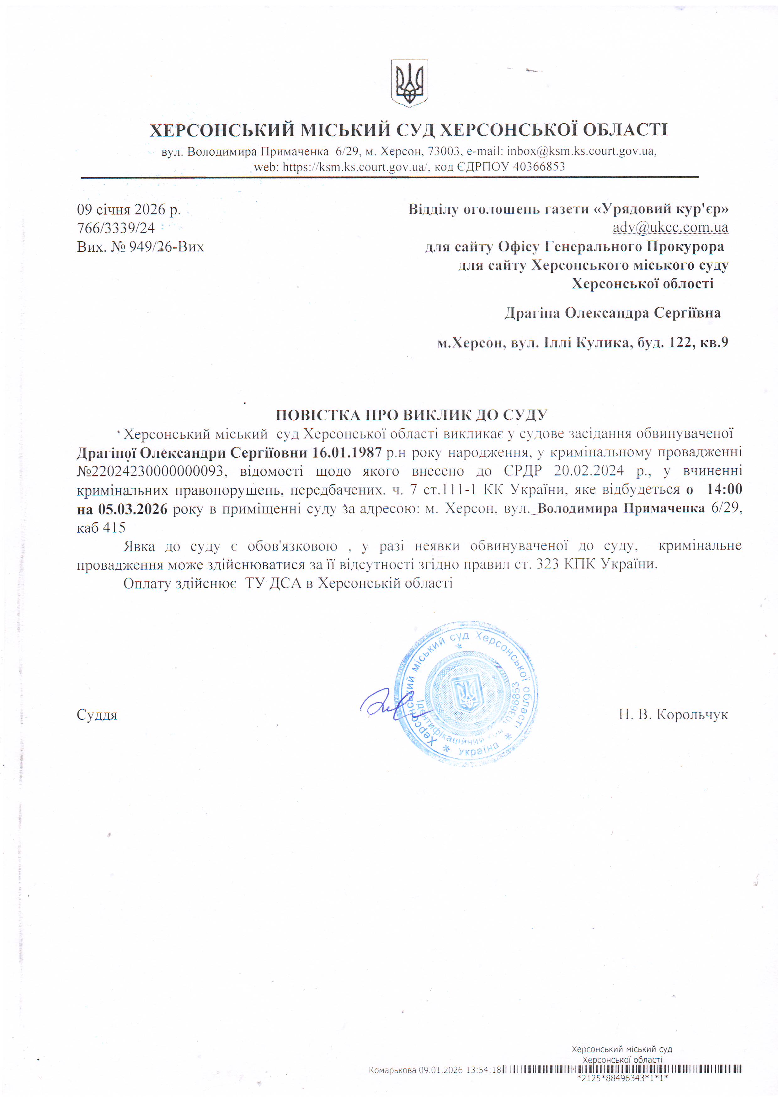 ОГОЛОШЕННЯ ПРО ВИКЛИК ДО СУДУ