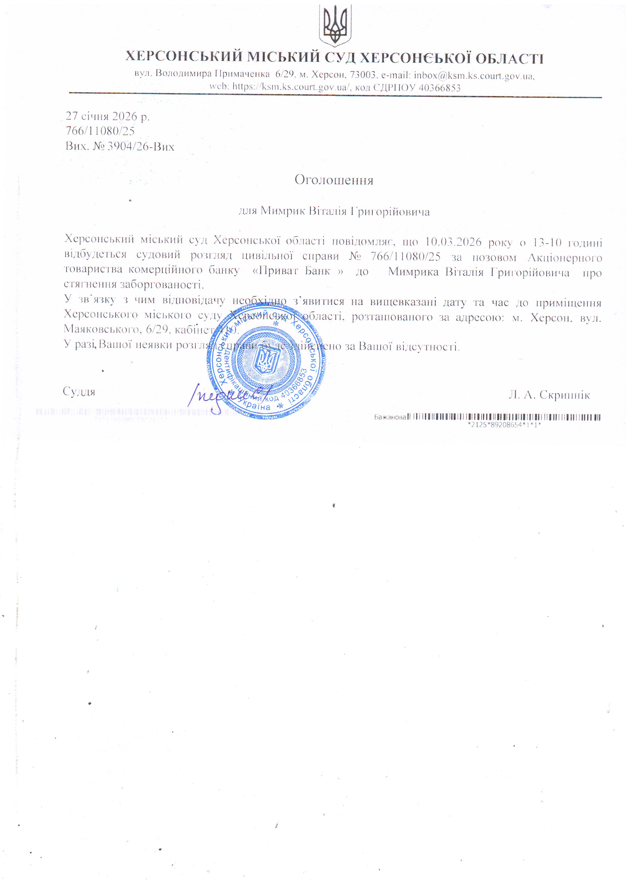 ОГОЛОШЕННЯ ПРО ВИКЛИК ДО СУДУ