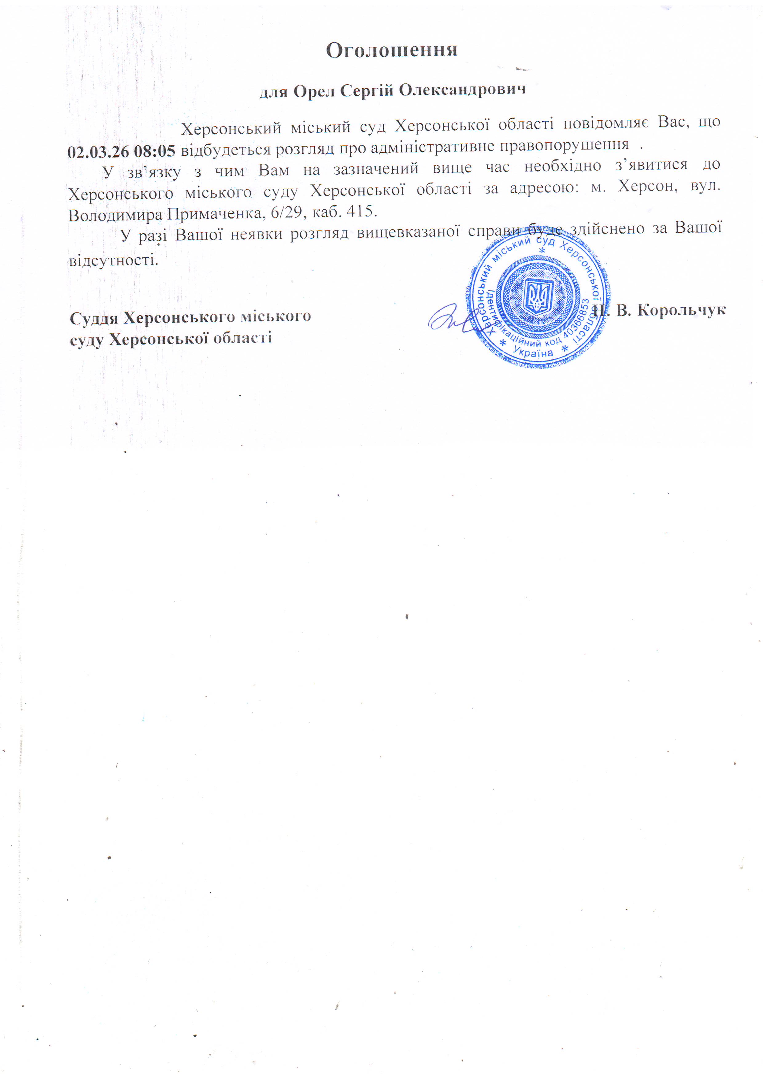 ОГОЛОШЕННЯ ПРО ВИКЛИК ДО СУДУ