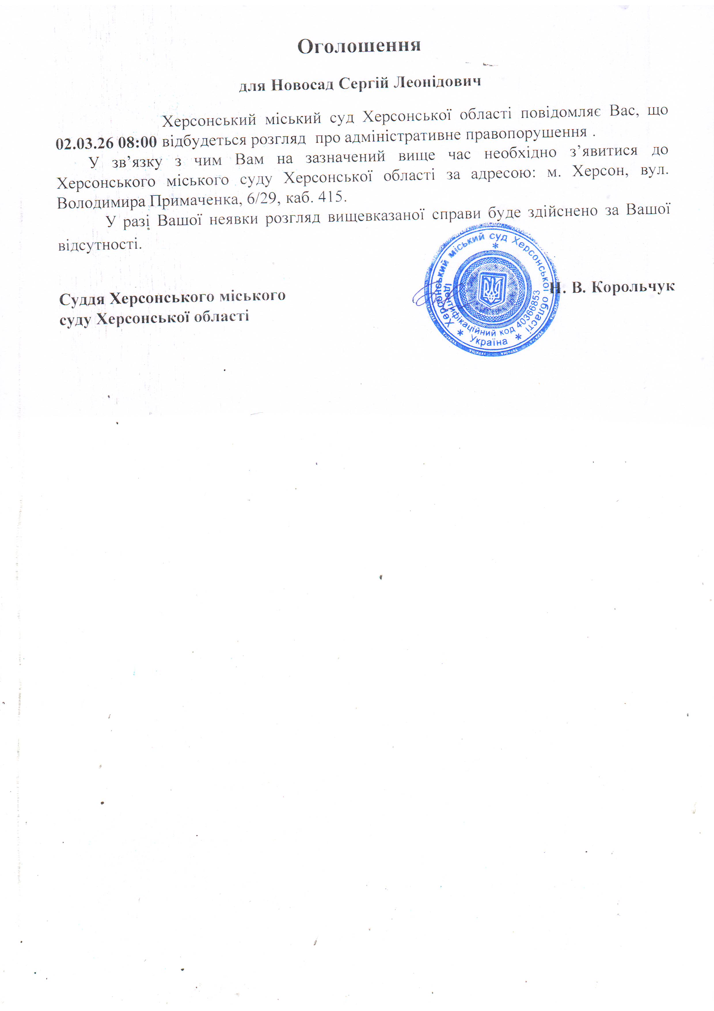 ОГОЛОШЕННЯ ПРО ВИКЛИК ДО СУДУ