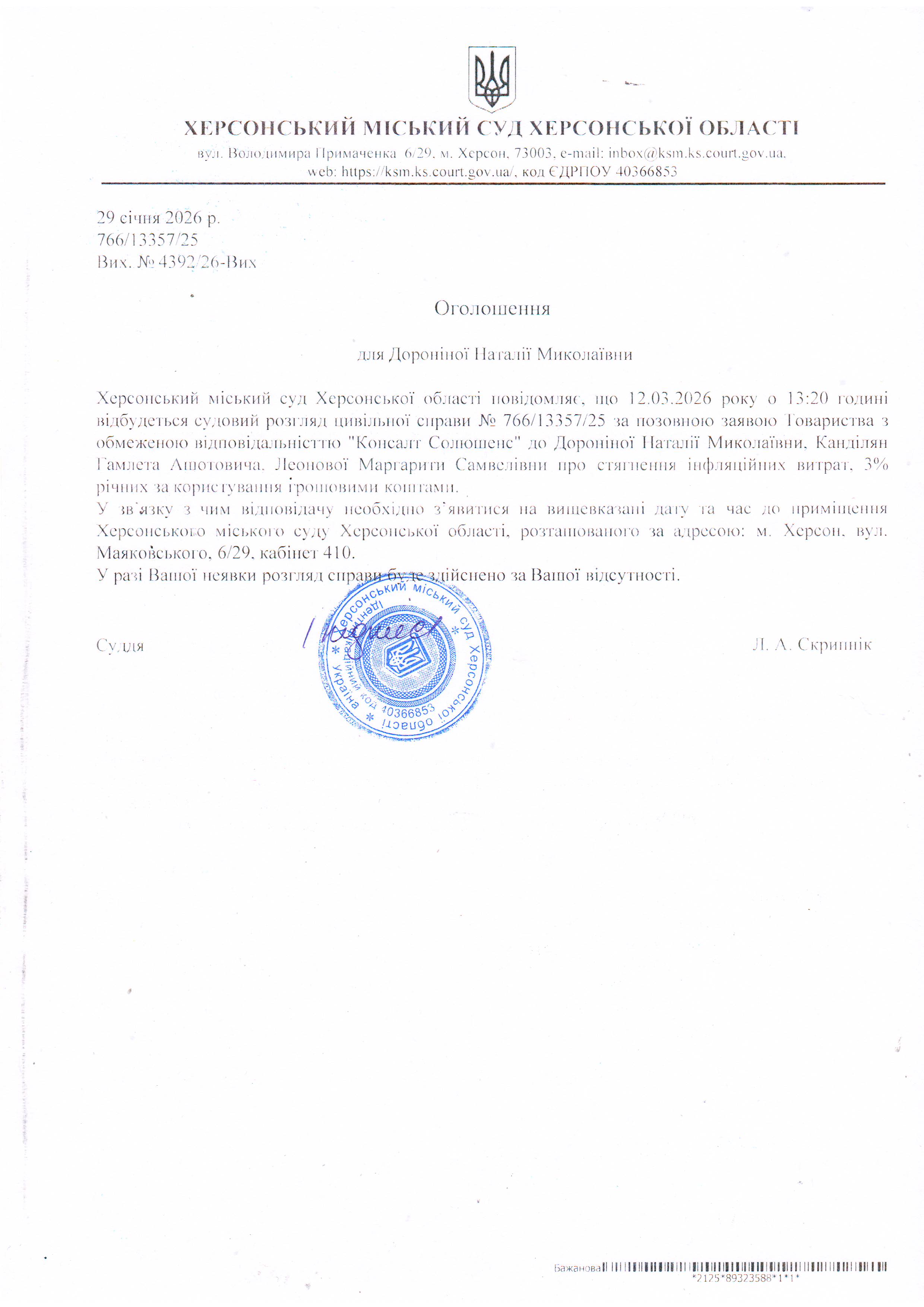 ОГОЛОШЕННЯ ПРО ВИКЛИК ДО СУДУ