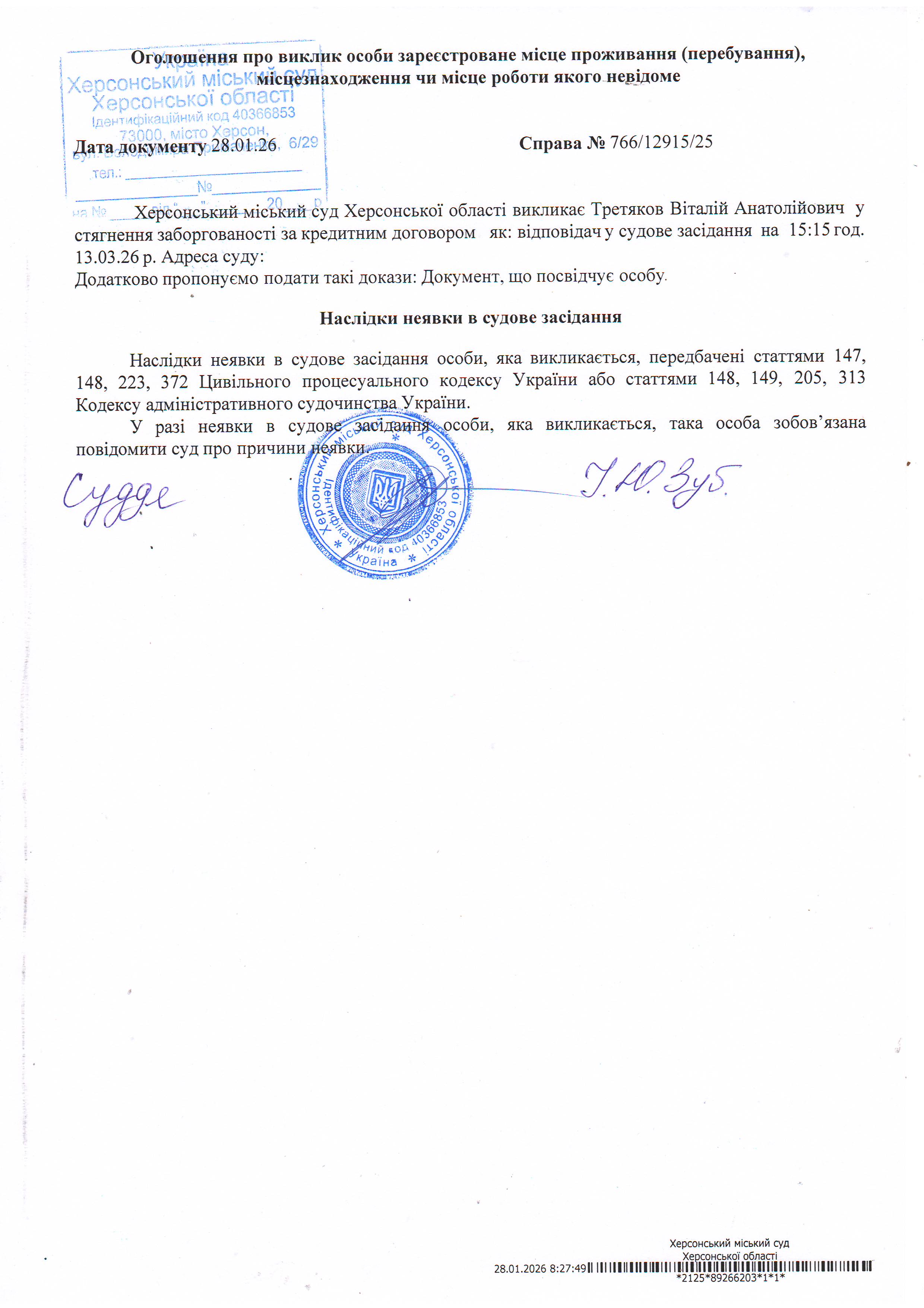 ОГОЛОШЕННЯ ПРО ВИКЛИК ДО СУДУ