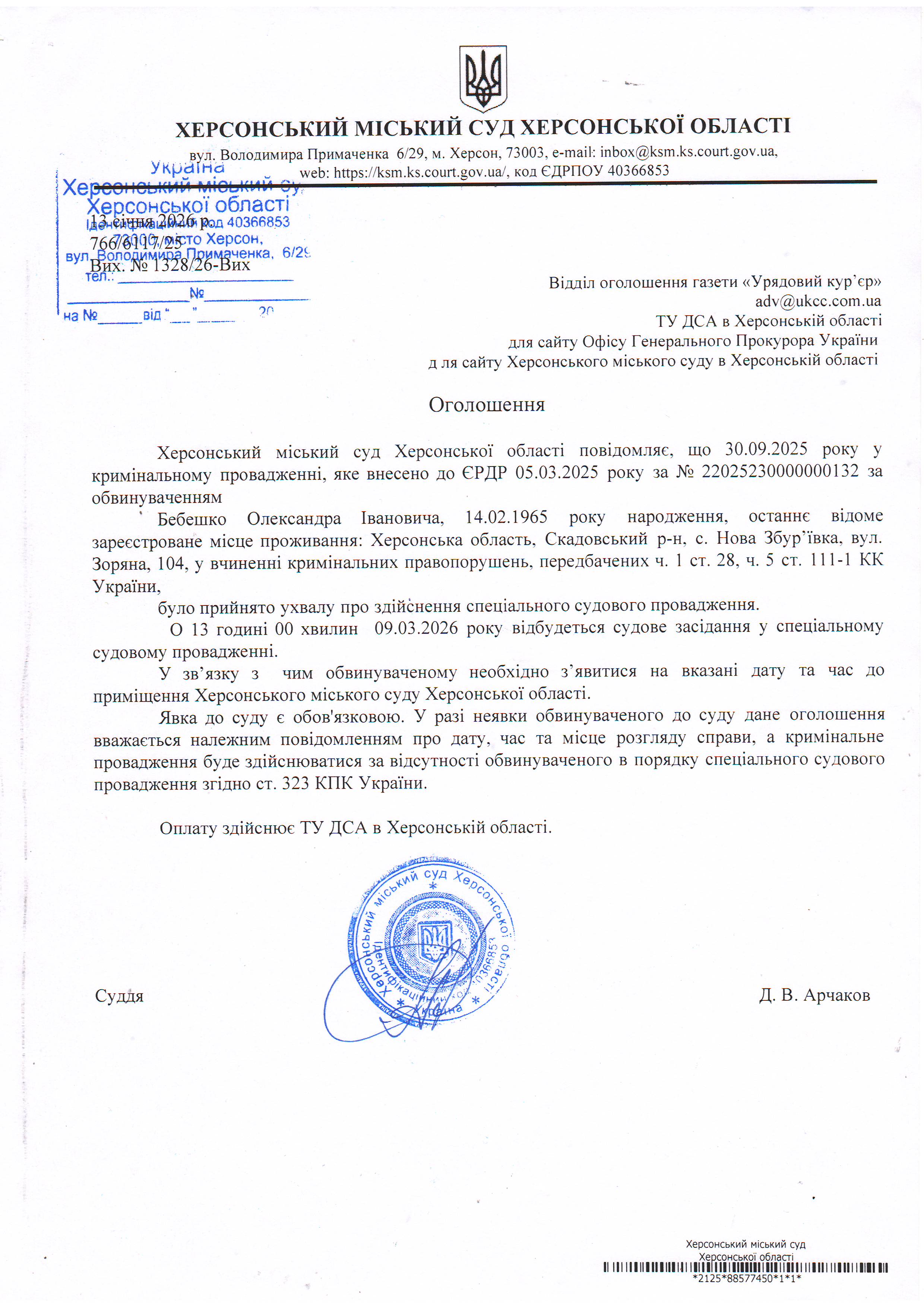 Оголошення про виклик особи в суд та повідомлення про судове рішення