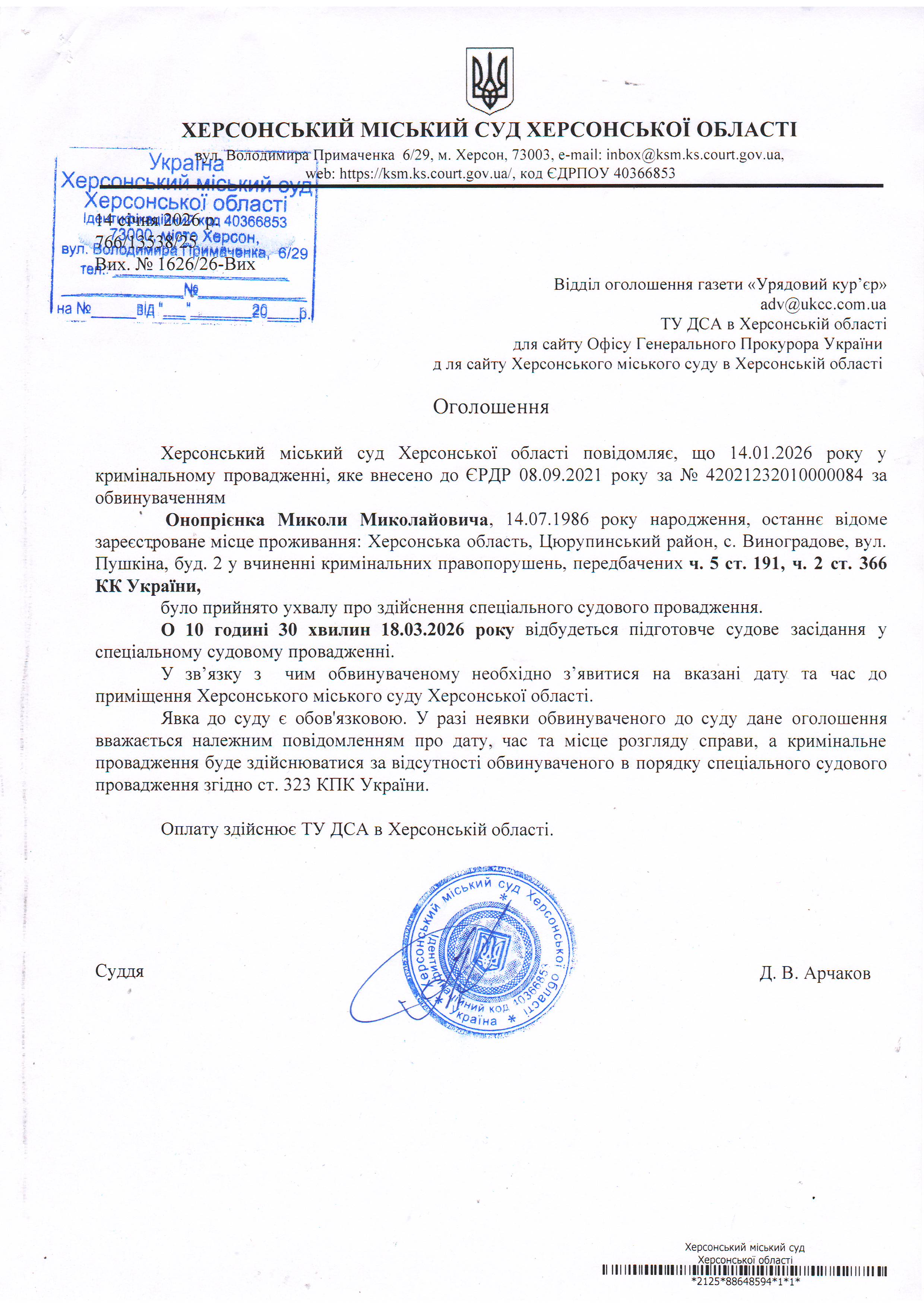 Оголошення про виклик особи в суд та повідомлення про судове рішення