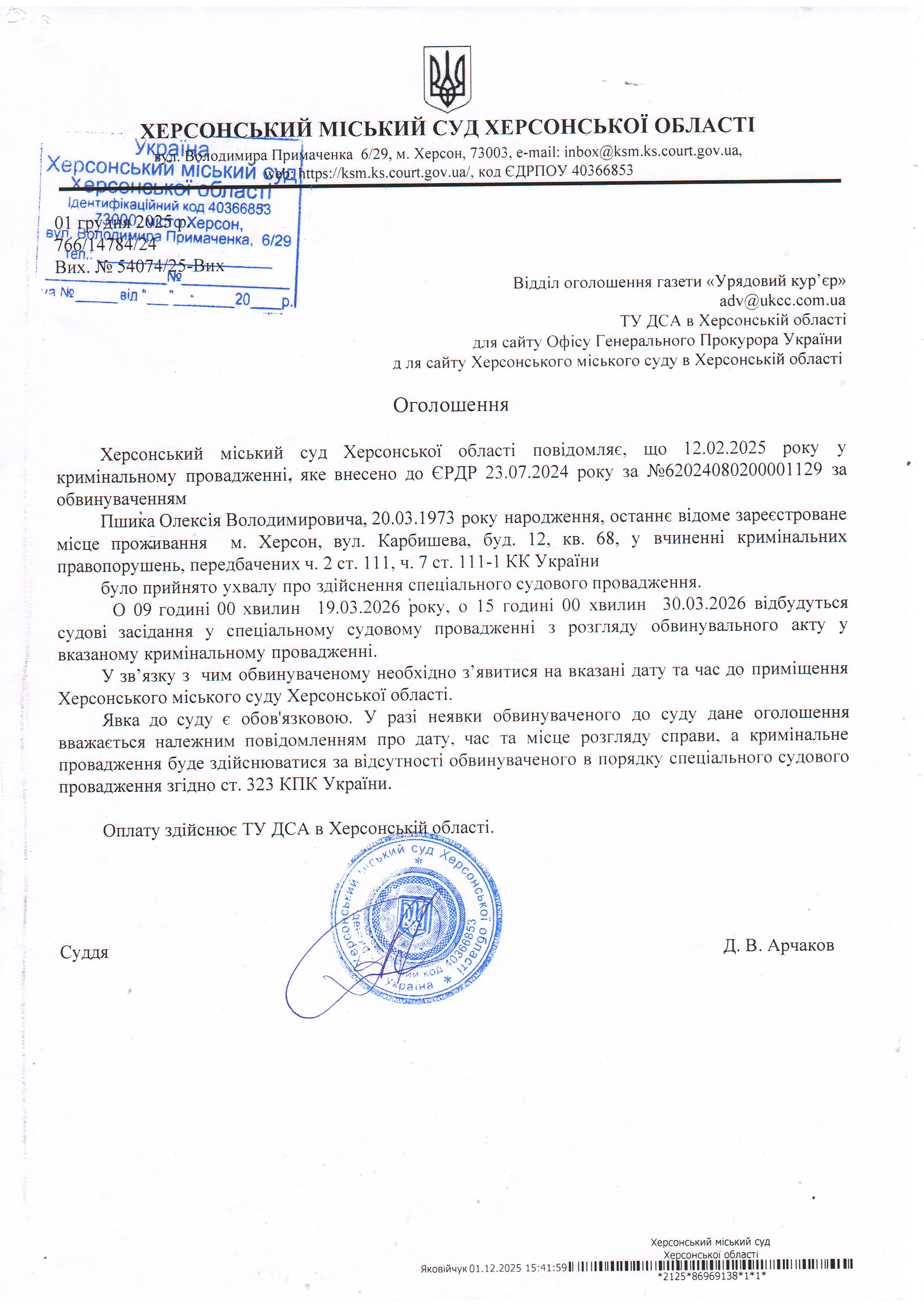 Оголошення про виклик особи в суд та повідомлення про судове рішення