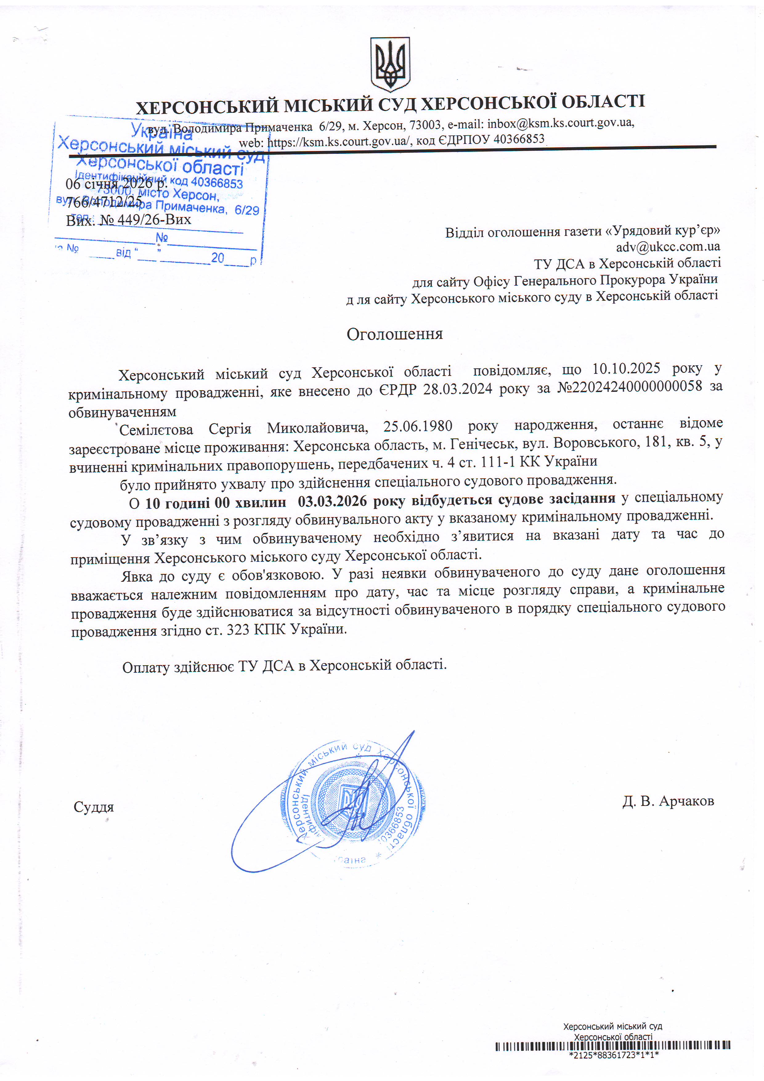 Оголошення про виклик особи в суд та повідомлення про судове рішення