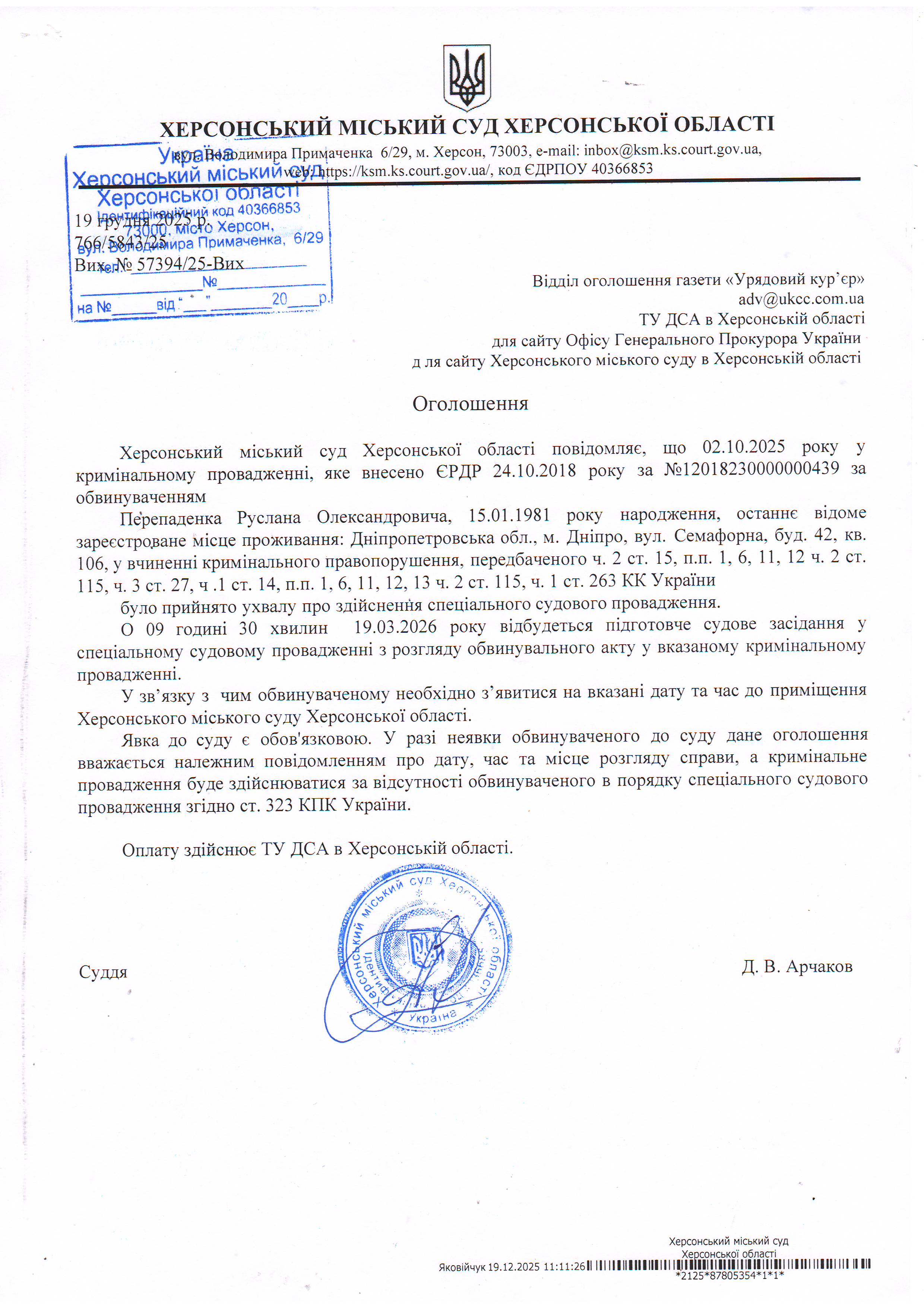 Оголошення для Перепаденка Руслана Олександровича