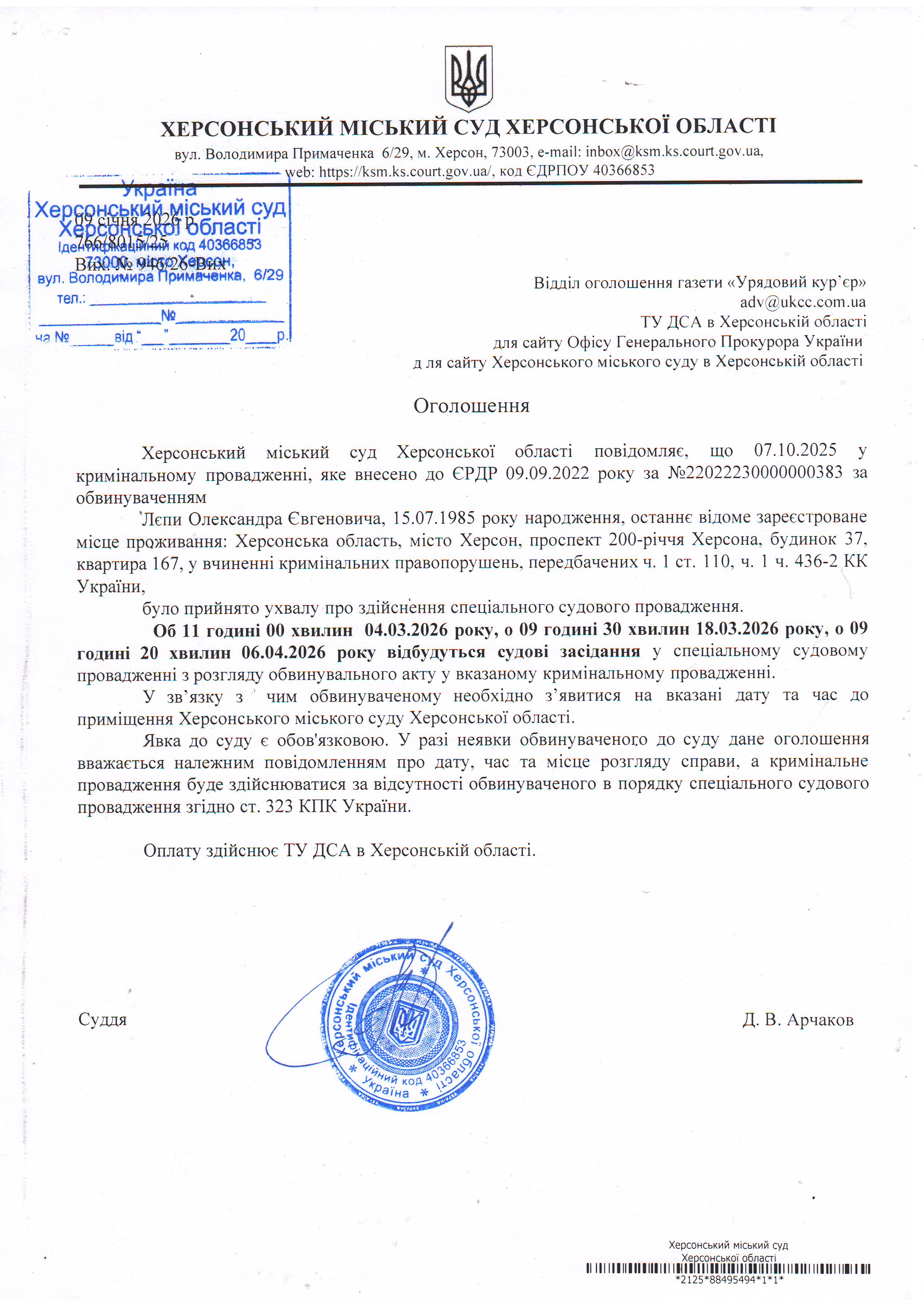 Оголошення про виклик особи в суд та повідомлення про судове рішення
