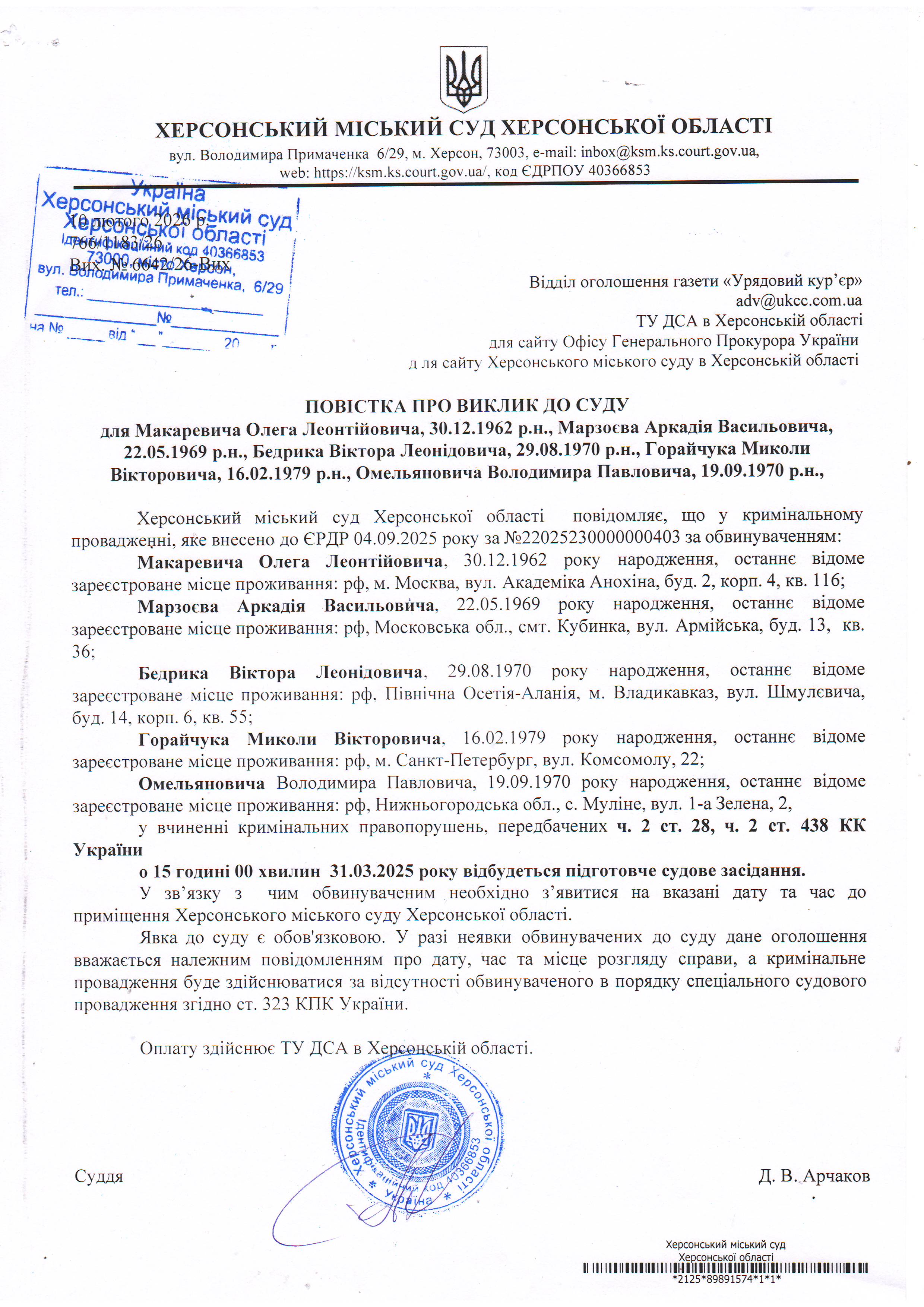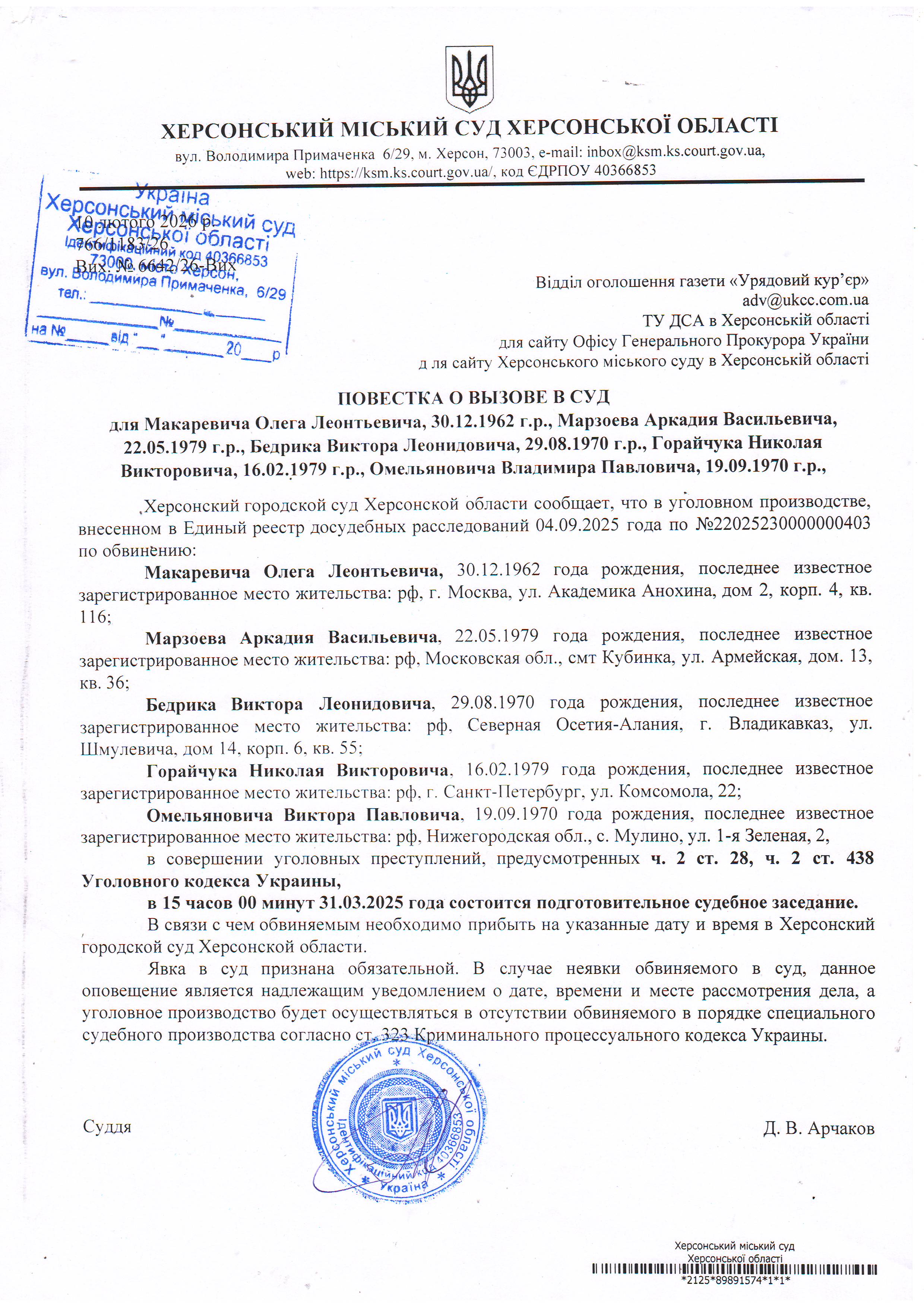 Оголошення для Макаревича Олега Леонтійовича, Марзоєва Аркадія Васильовича, Бедрика Віктора Леонідовича, Горайчука Миколи Вікторовича, Омельяновича Володимира Павловича