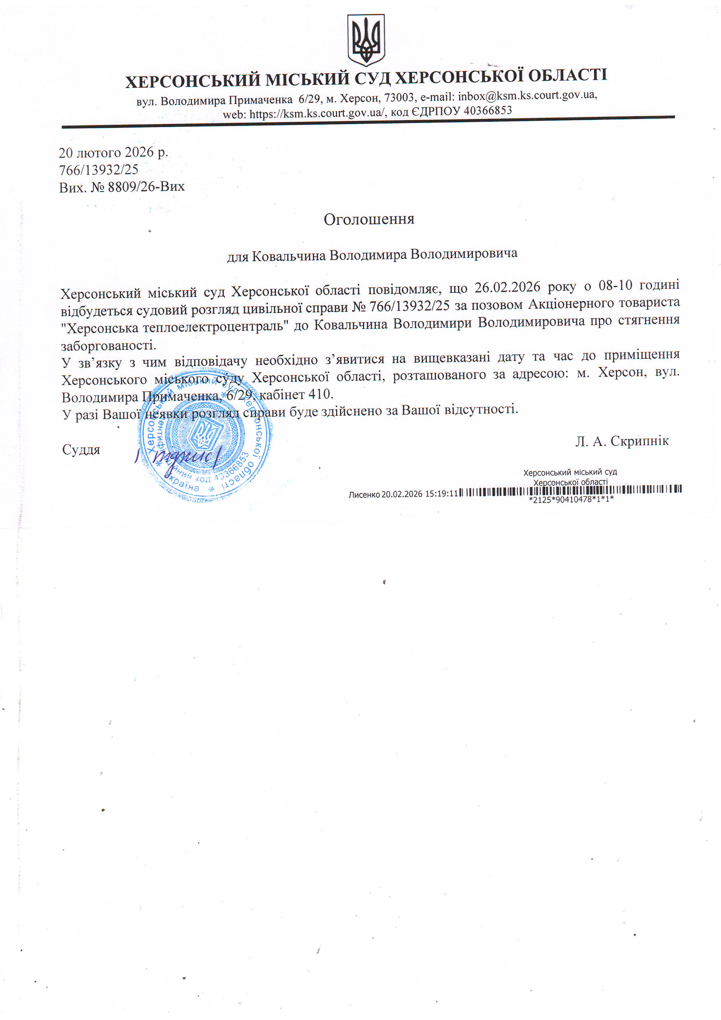ОГОЛОШЕННЯ ПРО ВИКЛИК ДО СУДУ