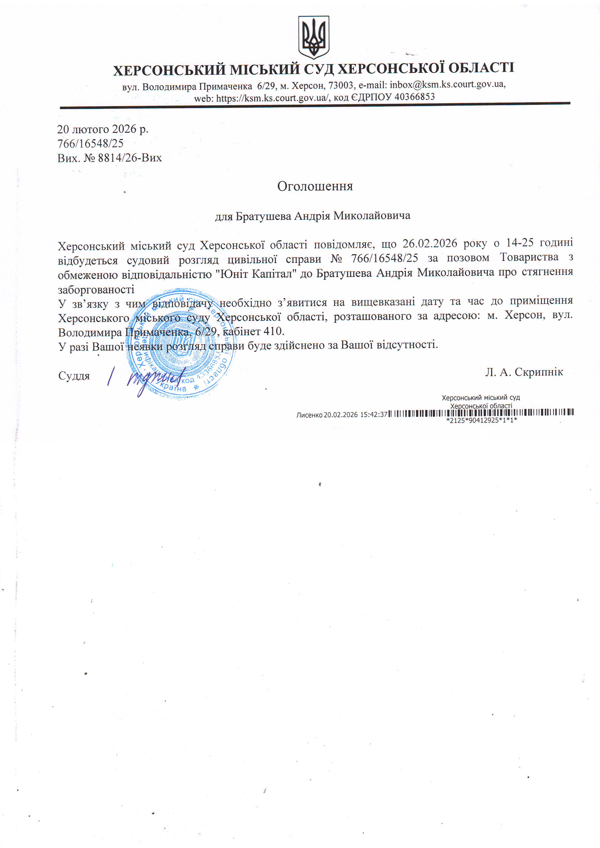 ОГОЛОШЕННЯ ПРО ВИКЛИК ДО СУДУ
