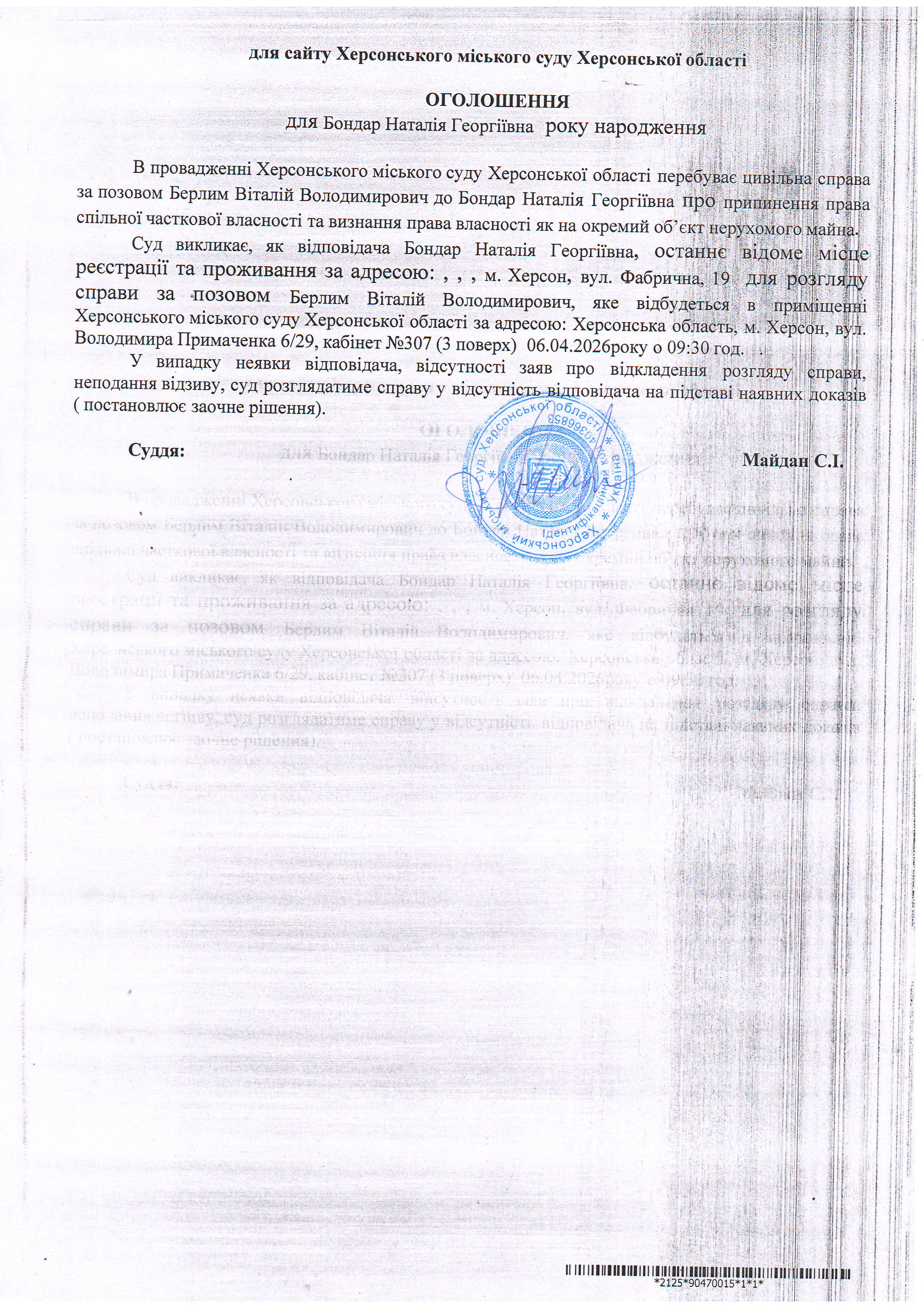 Оголошення для Бондар Наталії Георгіївни