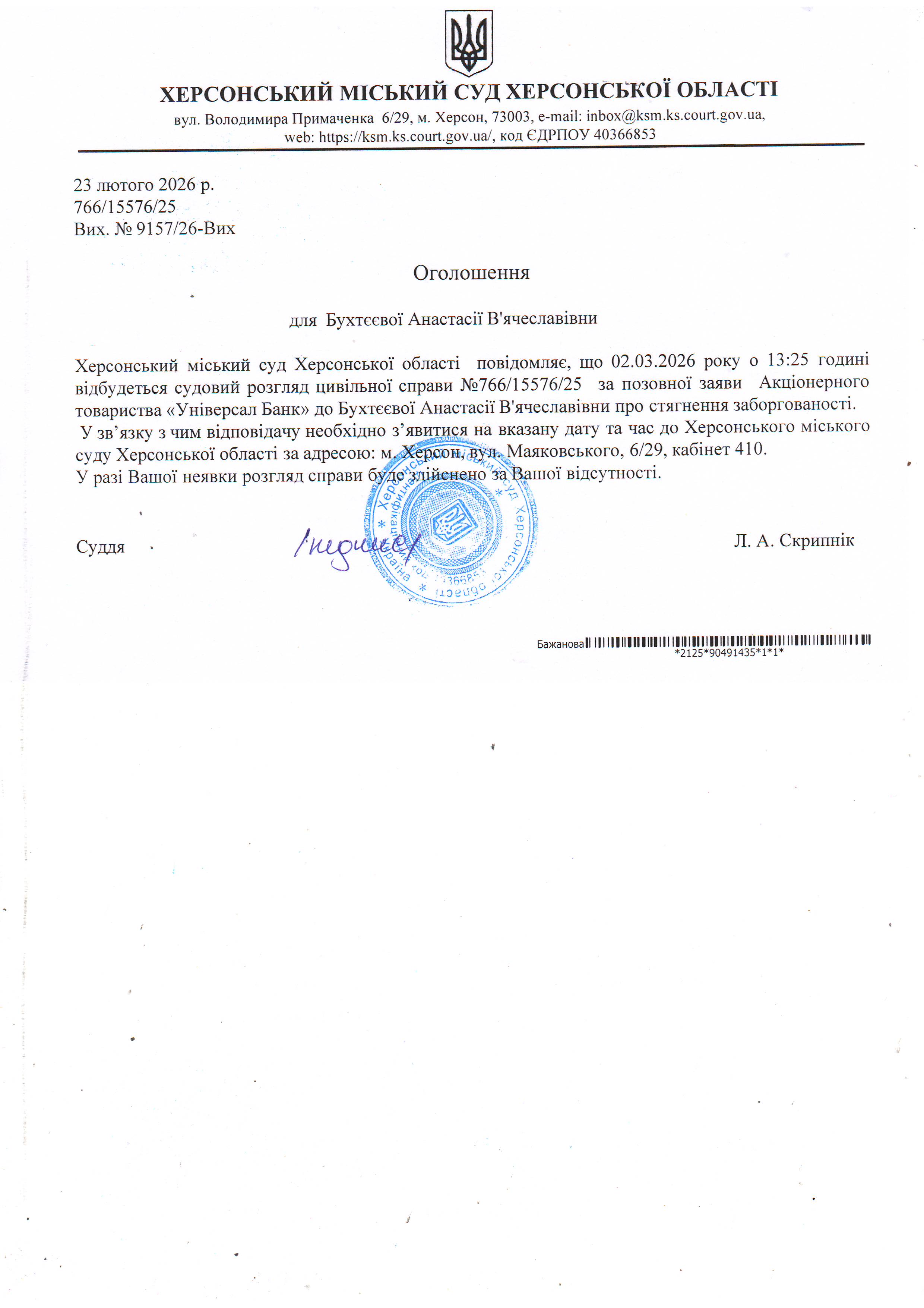 Оголошення для Бухтєєвої Анастасії В'ячеславівни
