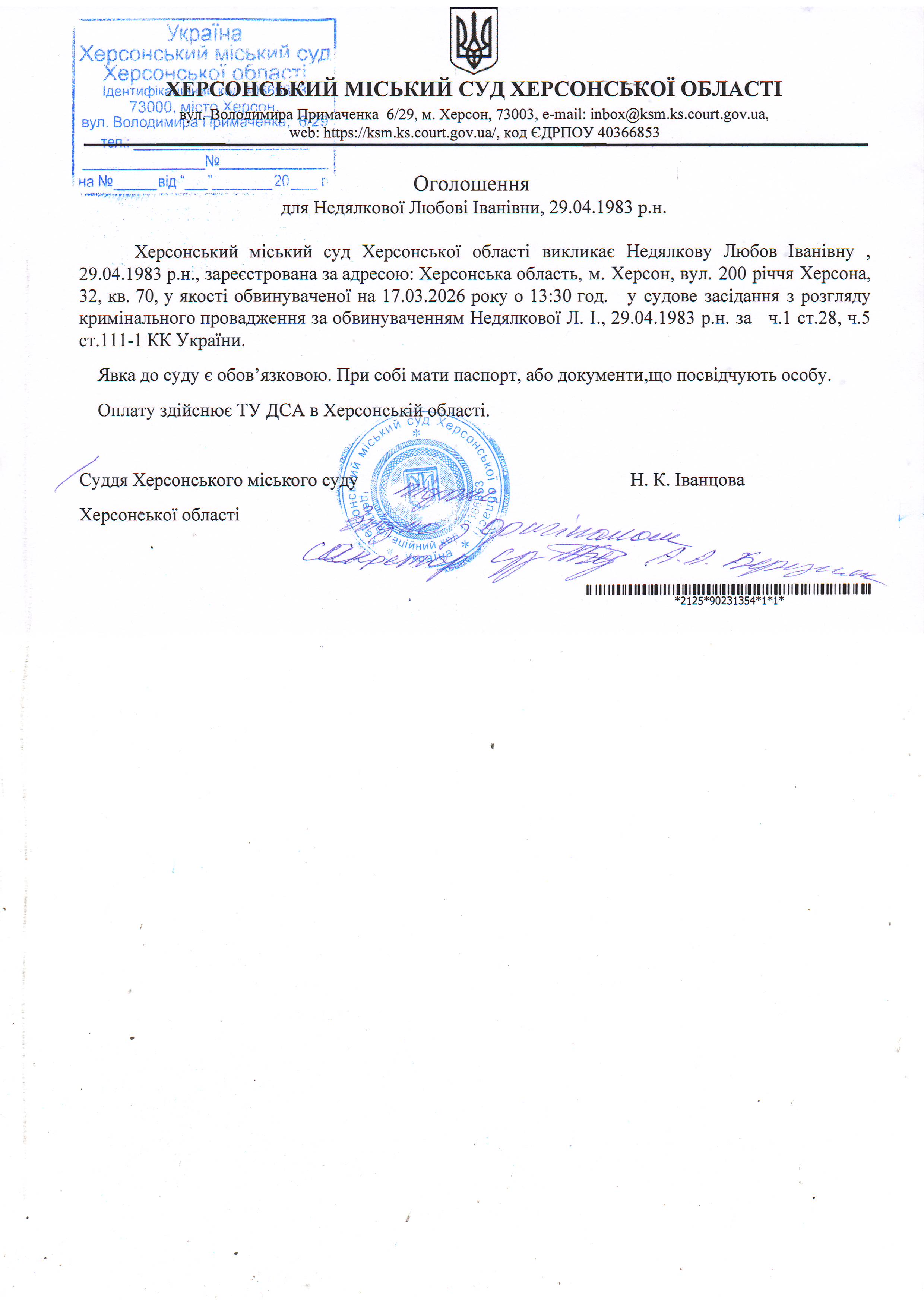 ОГОЛОШЕННЯ ПРО ВИКЛИК ДО СУДУ