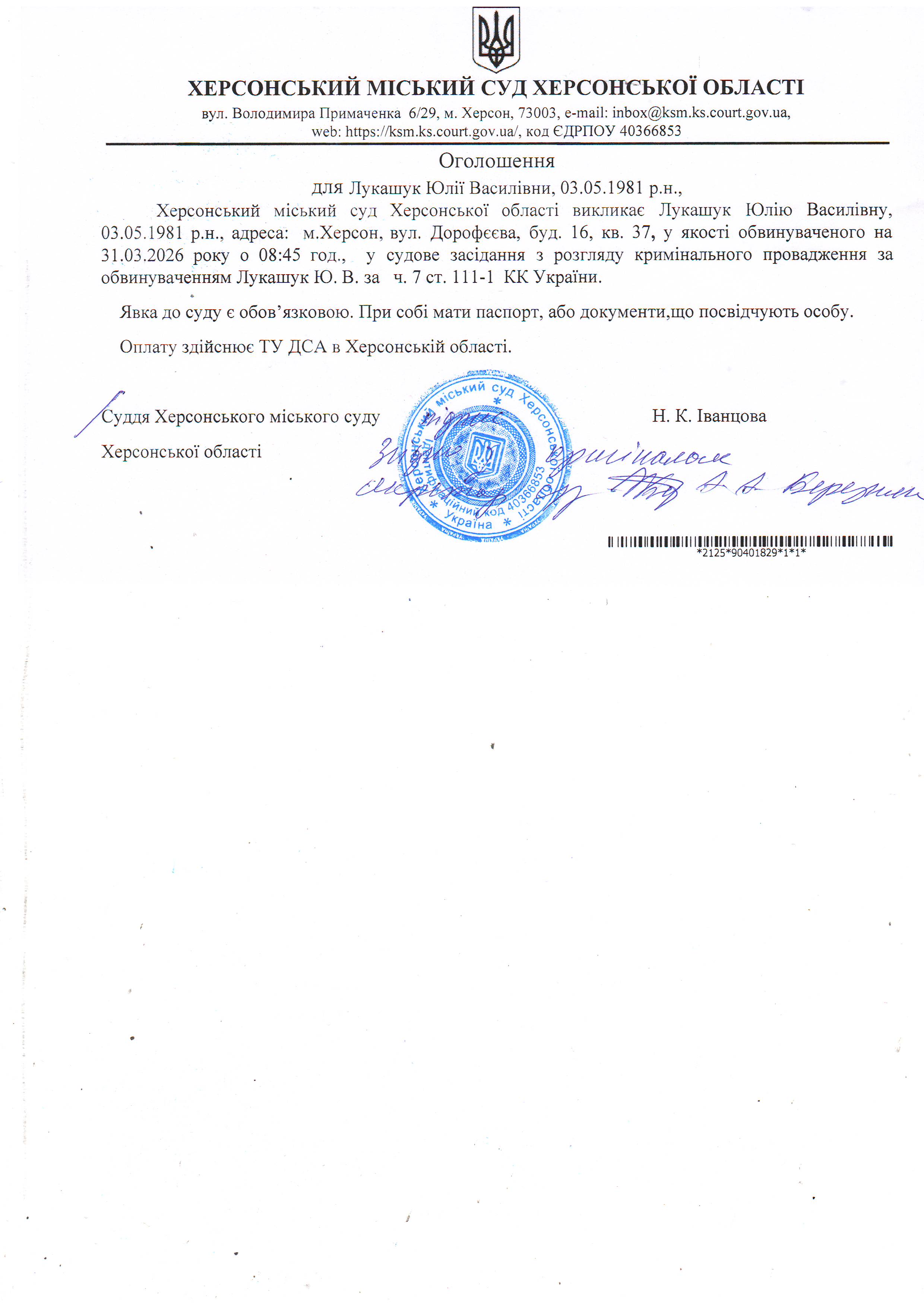 ОГОЛОШЕННЯ ПРО ВИКЛИК ДО СУДУ
