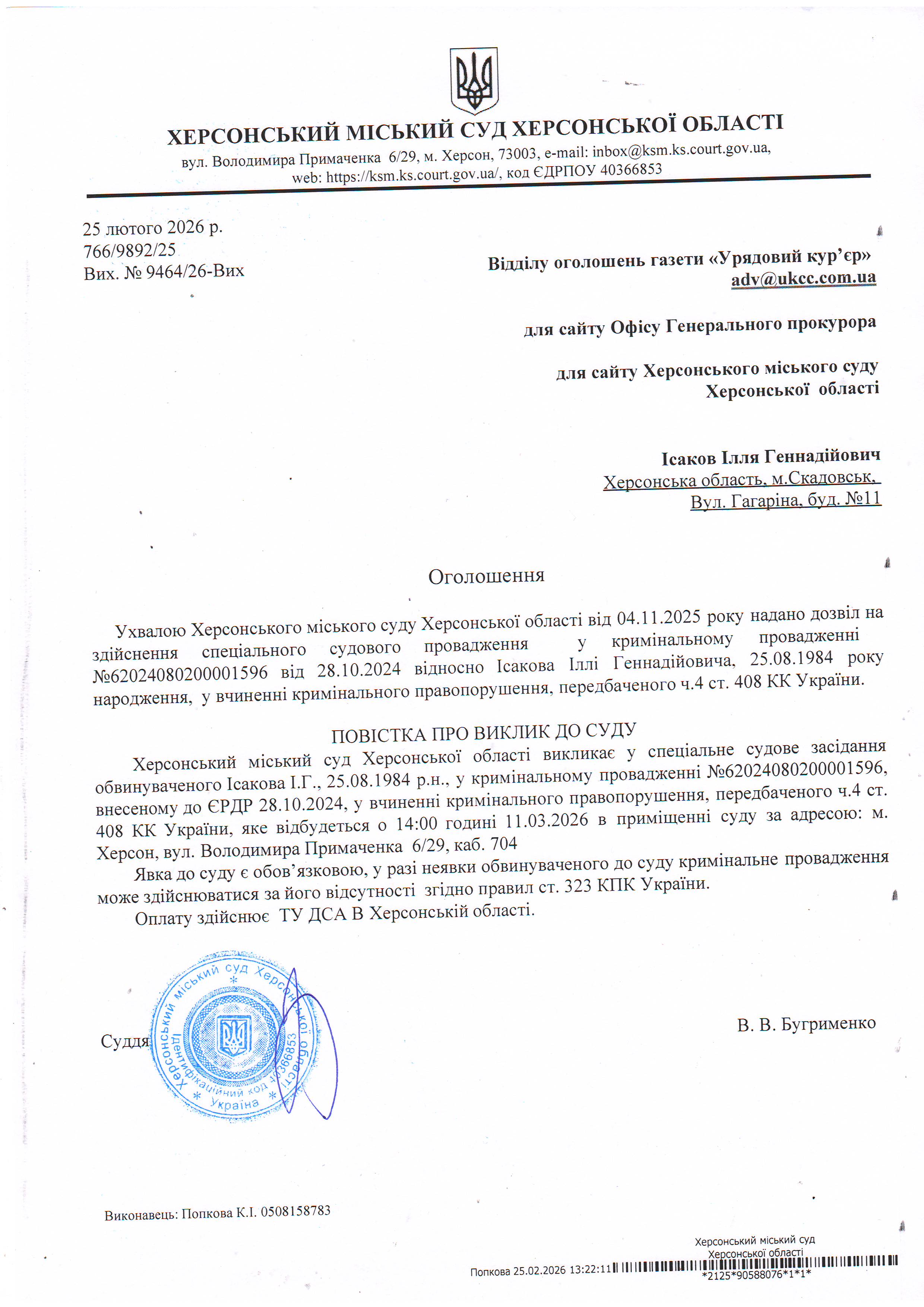 Оголошення про виклик особи в суд та повідомлення про судове рішення