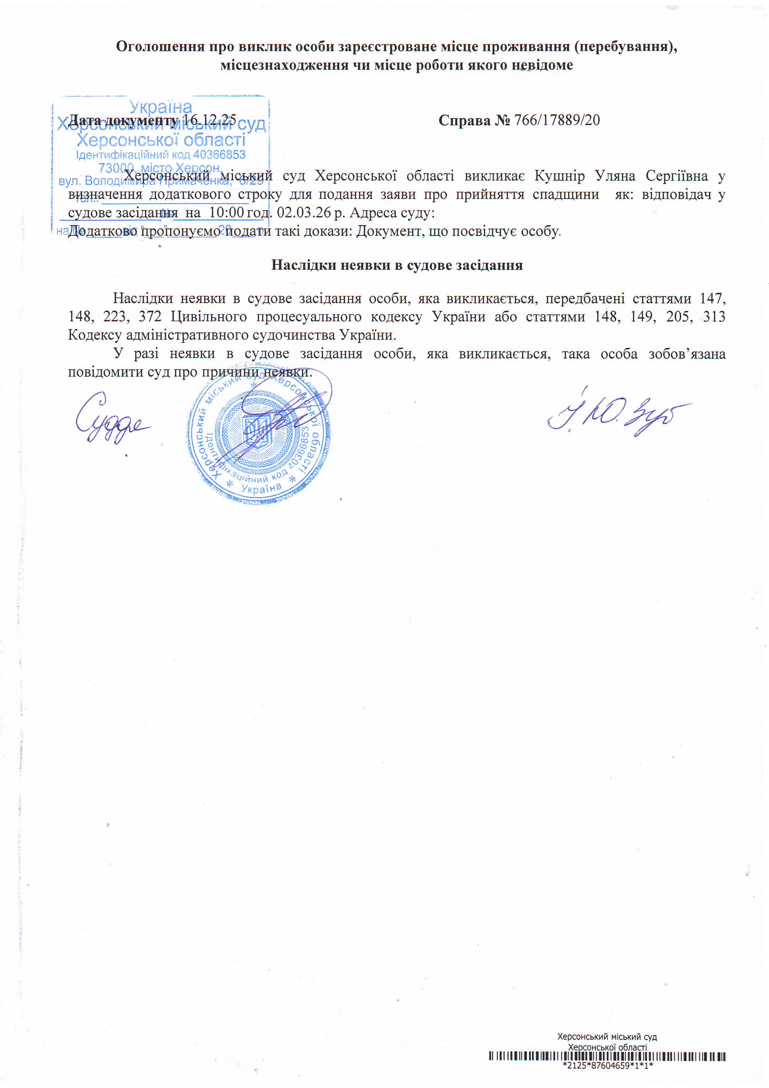 ОГОЛОШЕННЯ ПРО ВИКЛИК ДО СУДУ