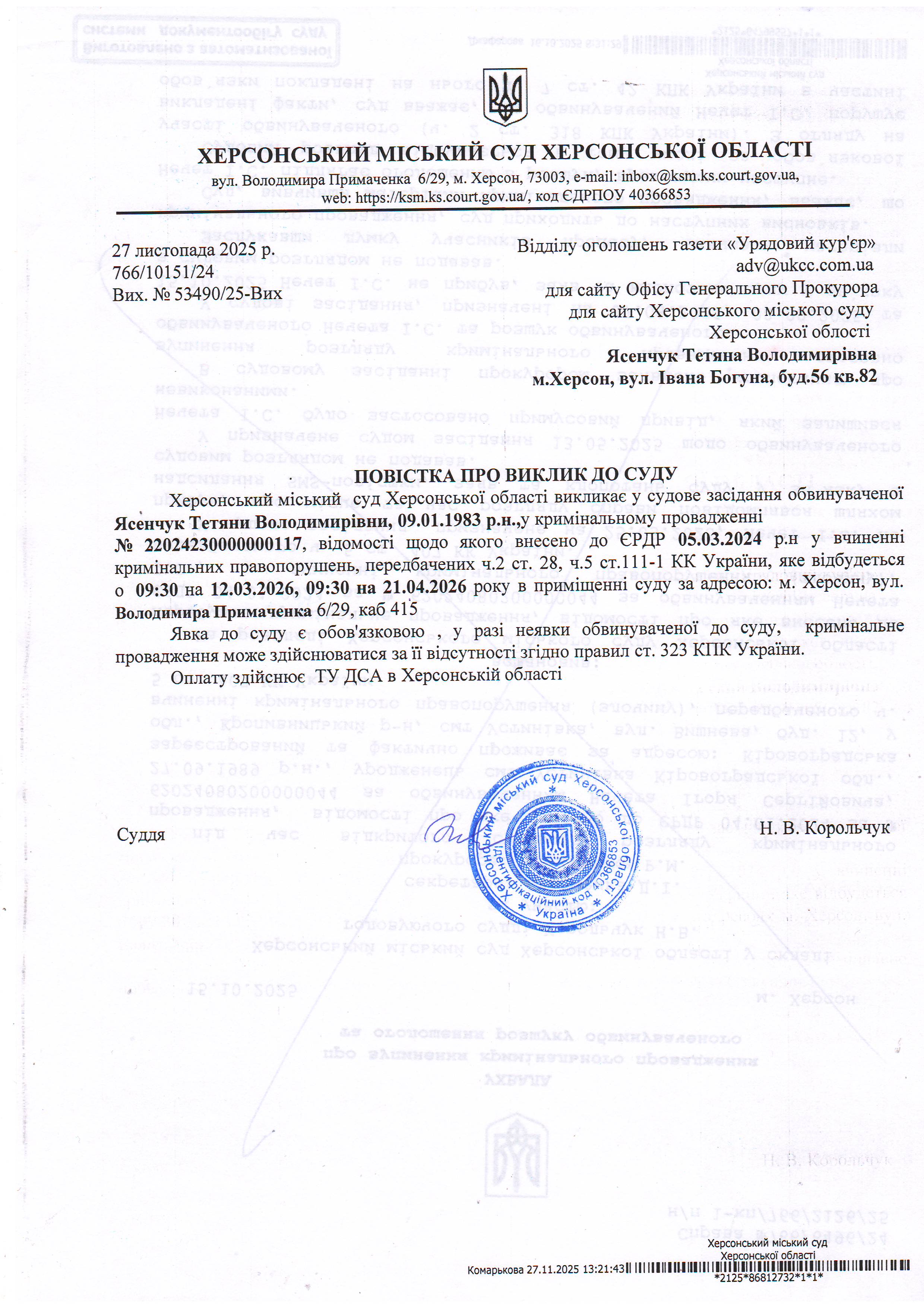 ОГОЛОШЕННЯ ПРО ВИКЛИК ДО СУДУ
