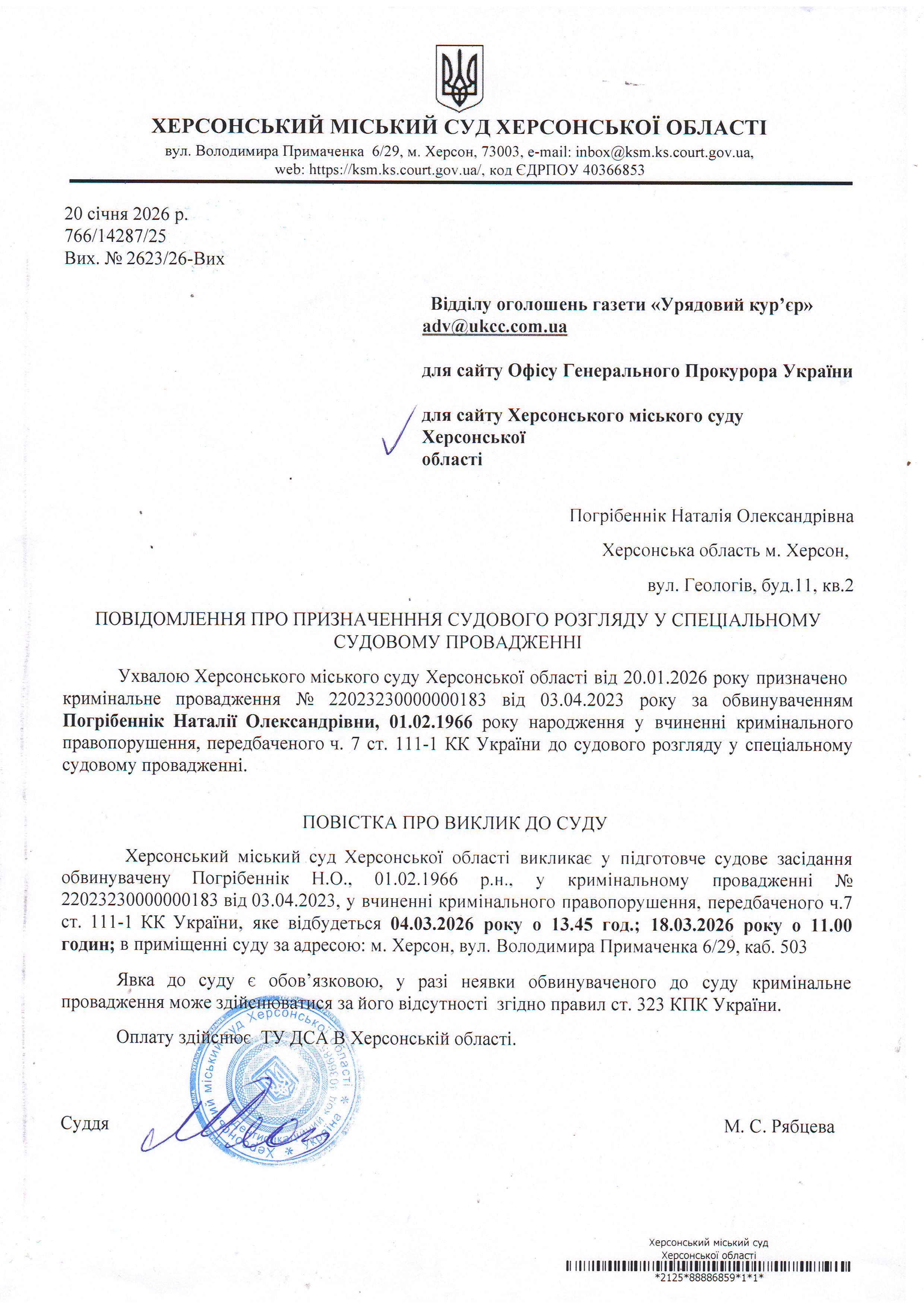 Оголошення про виклик особи в суд та повідомлення про судове рішення