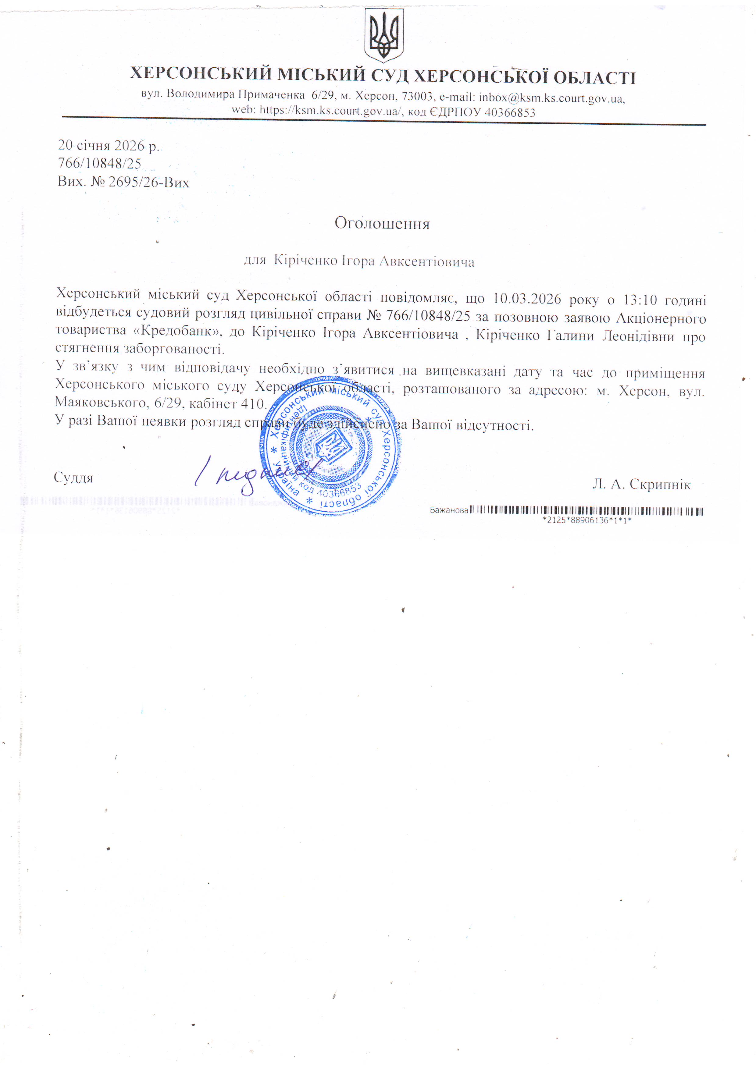 ОГОЛОШЕННЯ ПРО ВИКЛИК ДО СУДУ