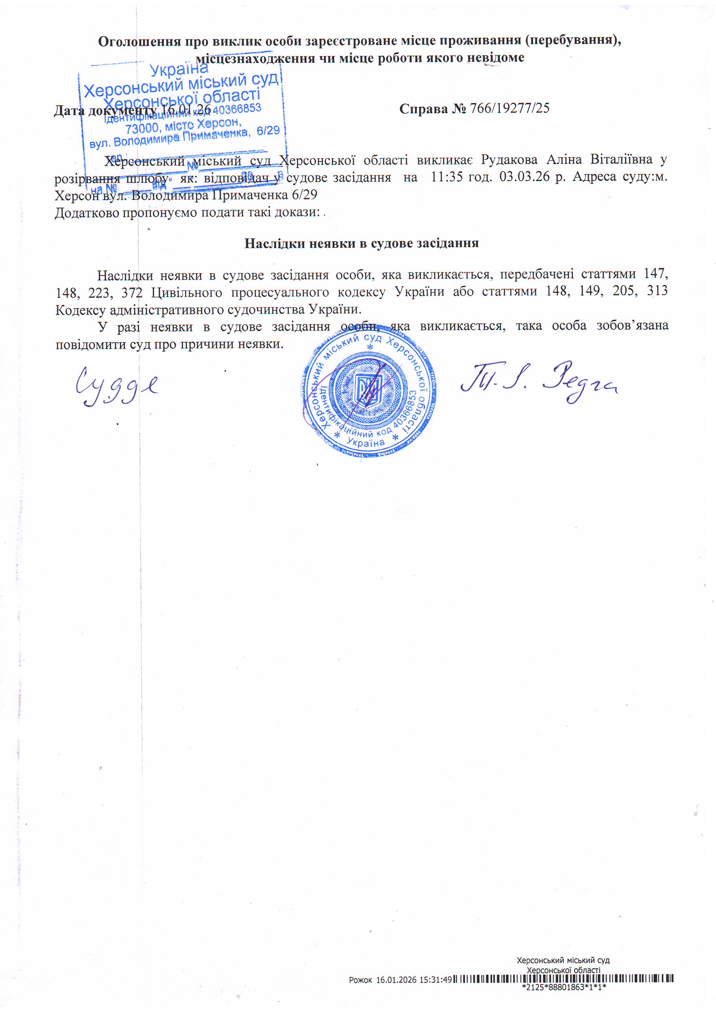 ОГОЛОШЕННЯ ПРО ВИКЛИК ДО СУДУ