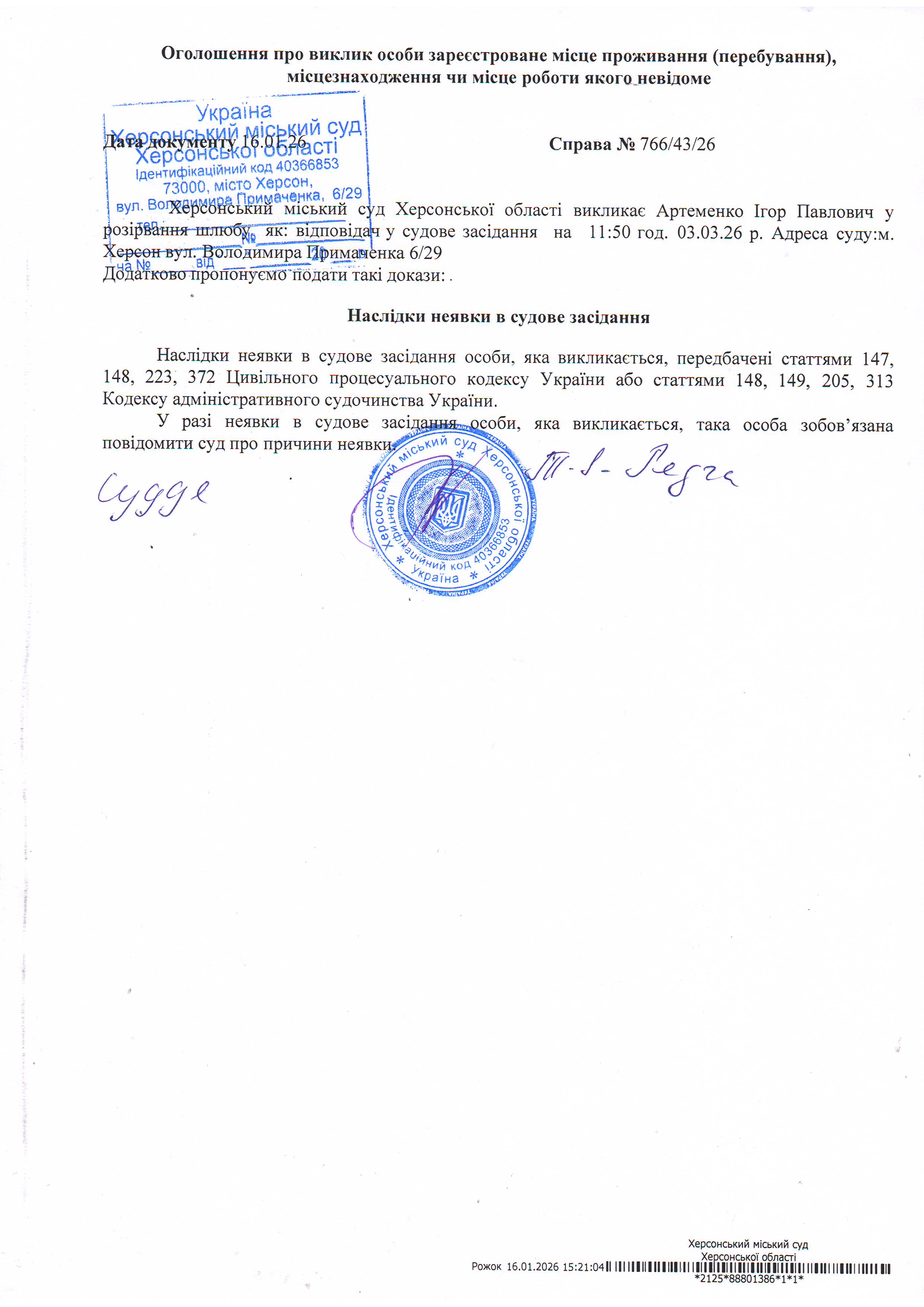 ОГОЛОШЕННЯ ПРО ВИКЛИК ДО СУДУ