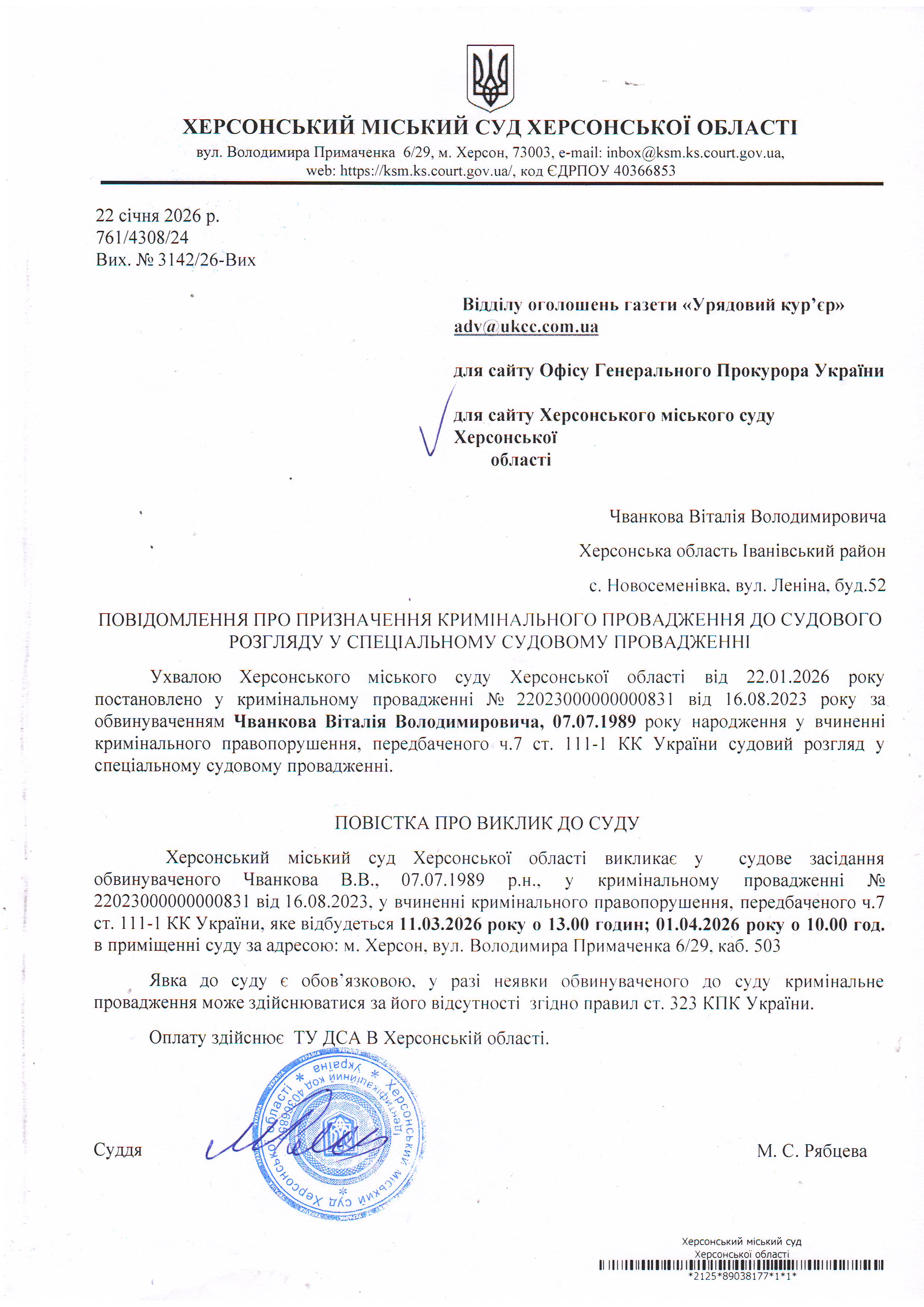 Оголошення про виклик особи в суд та повідомлення про судове рішення