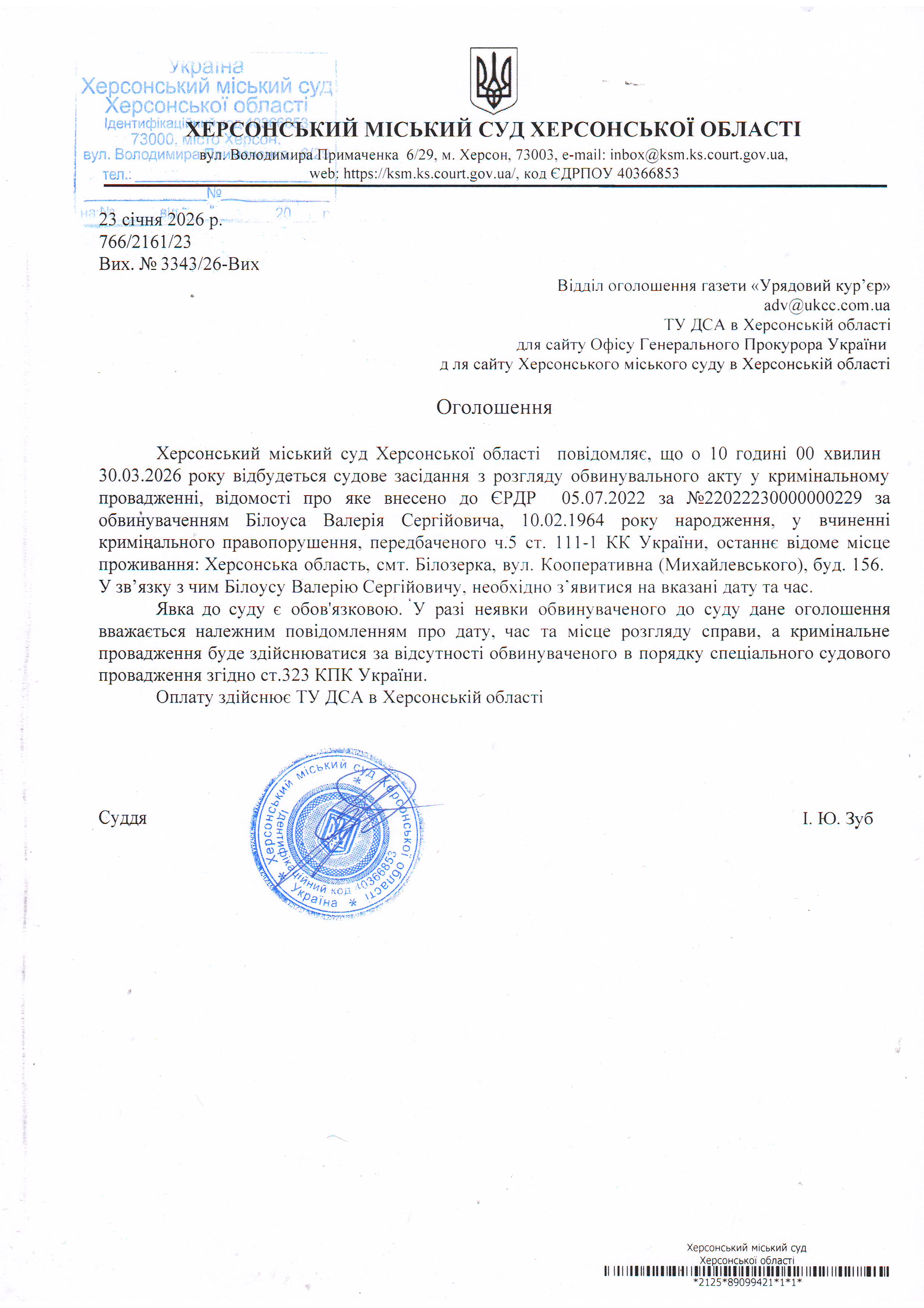 ОГОЛОШЕННЯ ПРО ВИКЛИК ДО СУДУ
