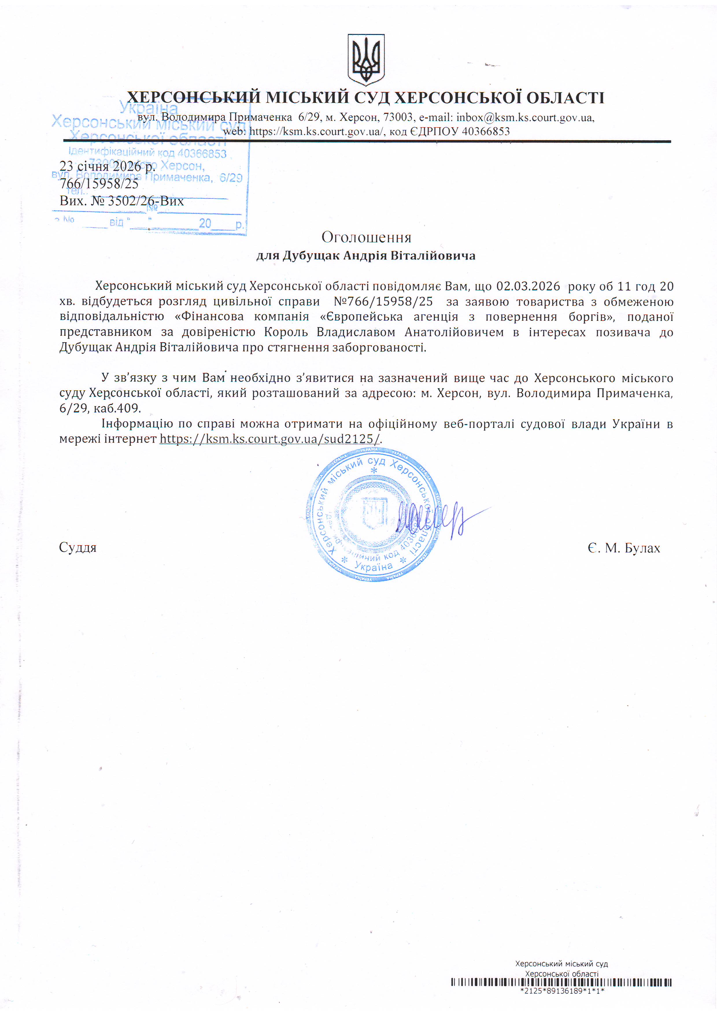 ОГОЛОШЕННЯ ПРО ВИКЛИК ДО СУДУ