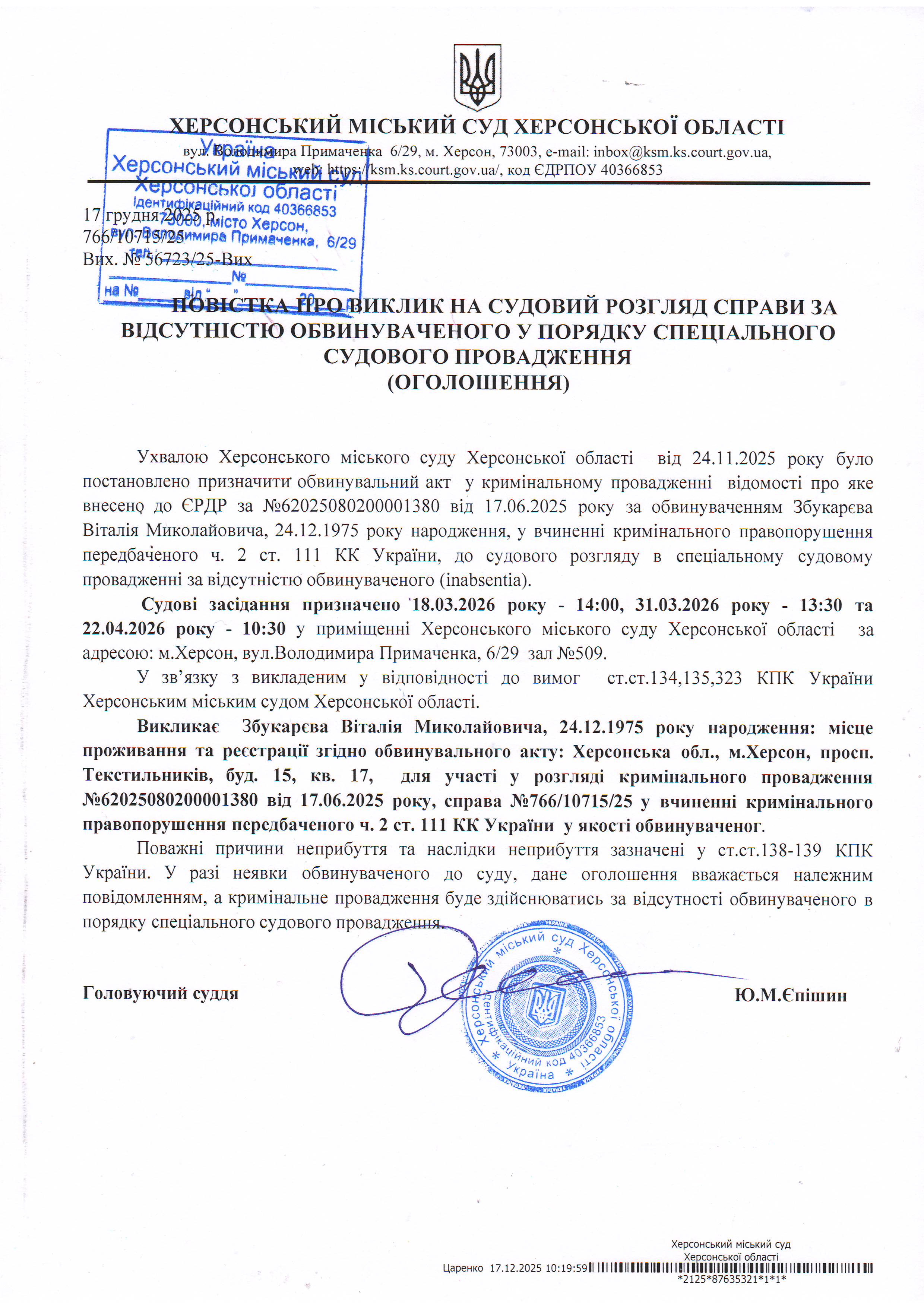 ОГОЛОШЕННЯ ПРО ВИКЛИК ДО СУДУ
