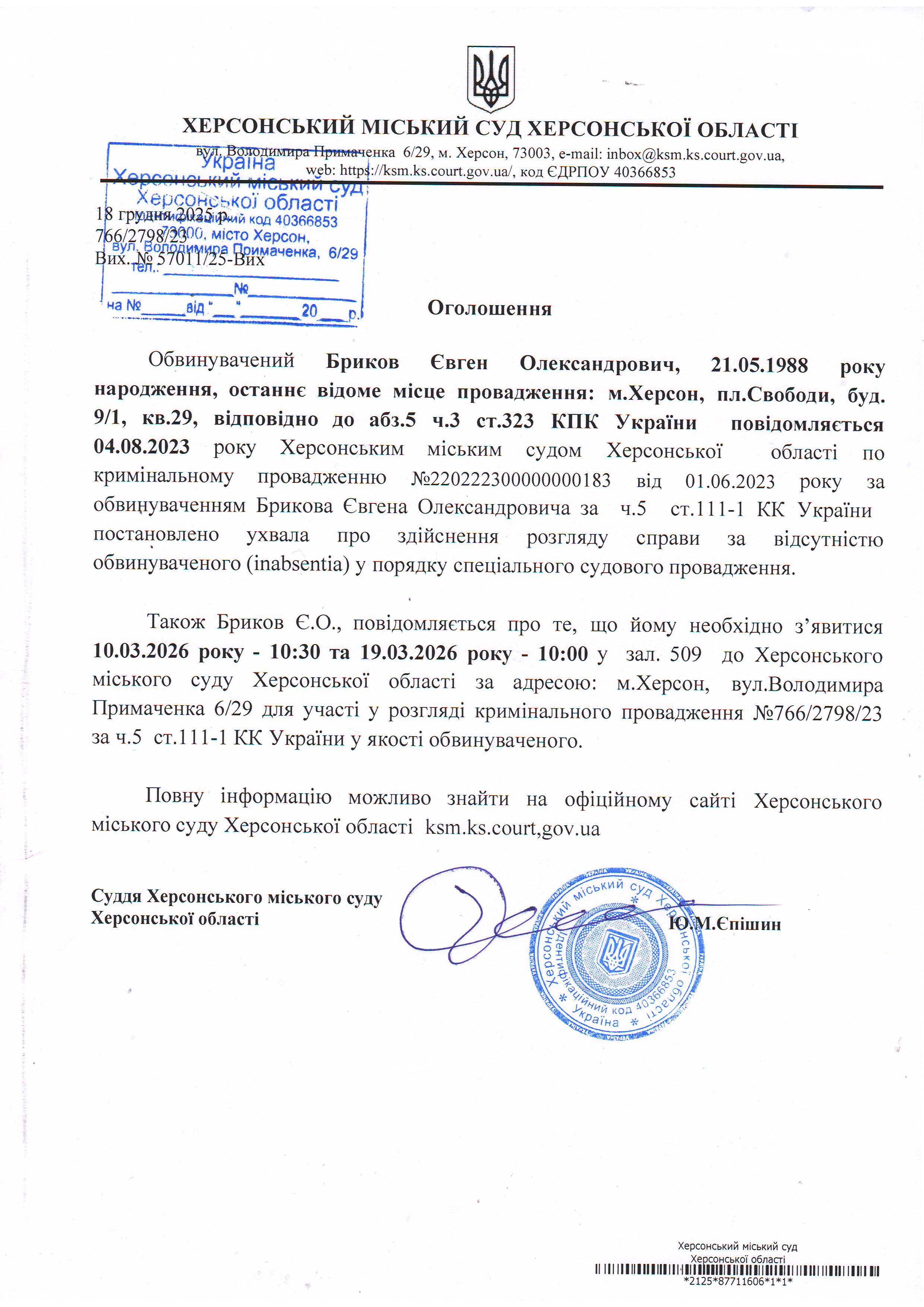 Оголошення про виклик особи в суд та повідомлення про судове рішення
