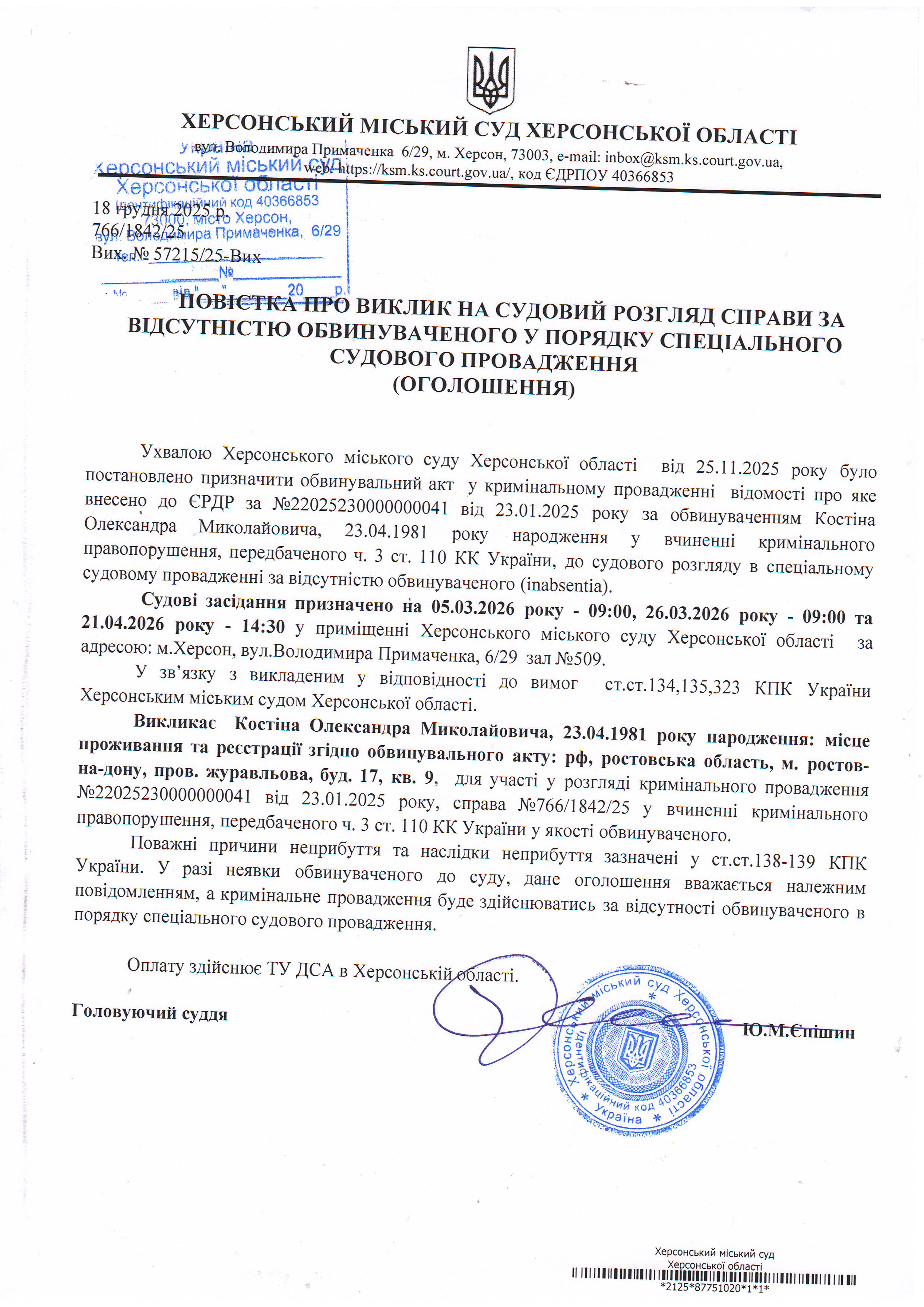 ОГОЛОШЕННЯ ПРО ВИКЛИК ДО СУДУ