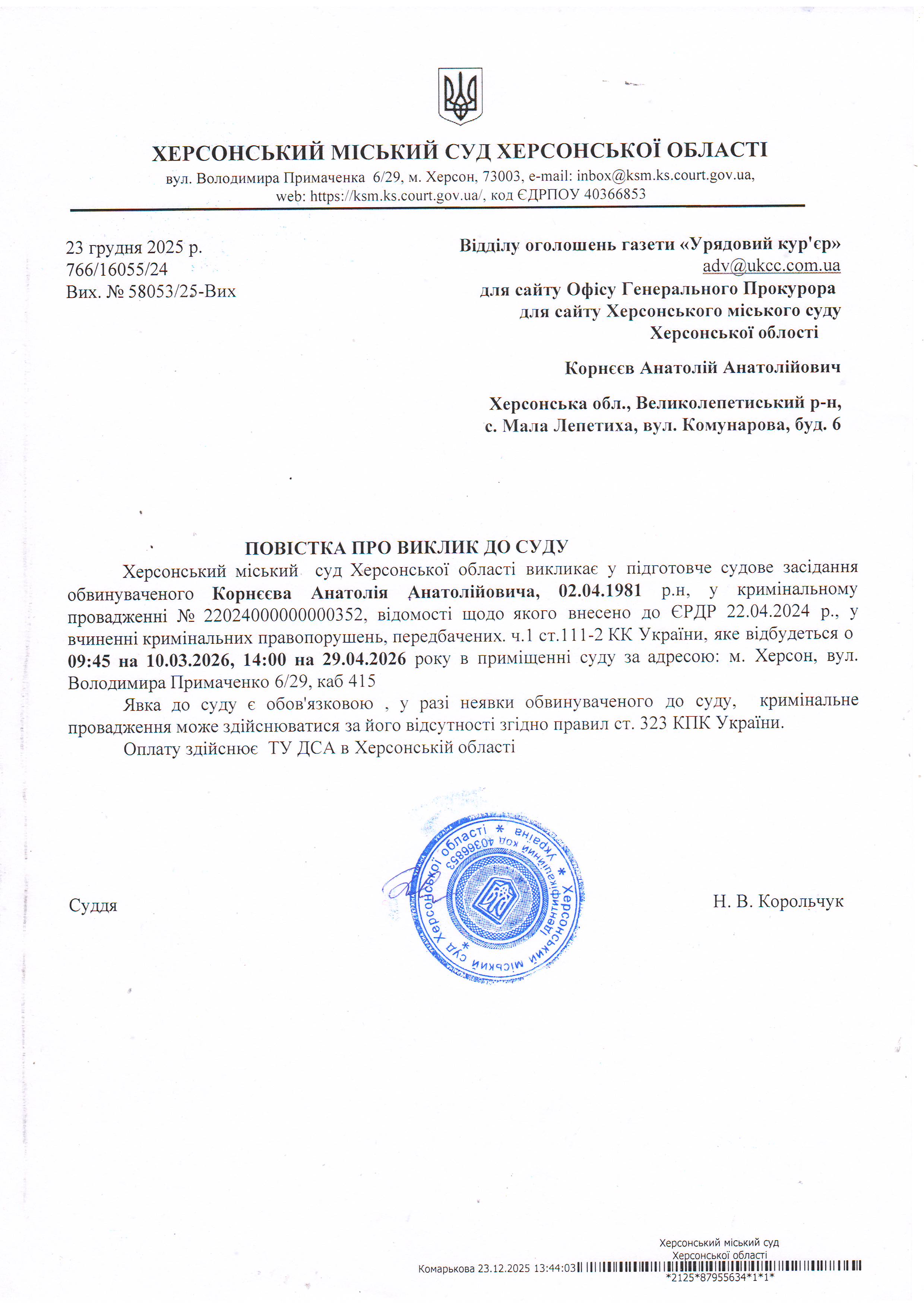 Оголошення для Корнєєва Анатолія Анатолійовича