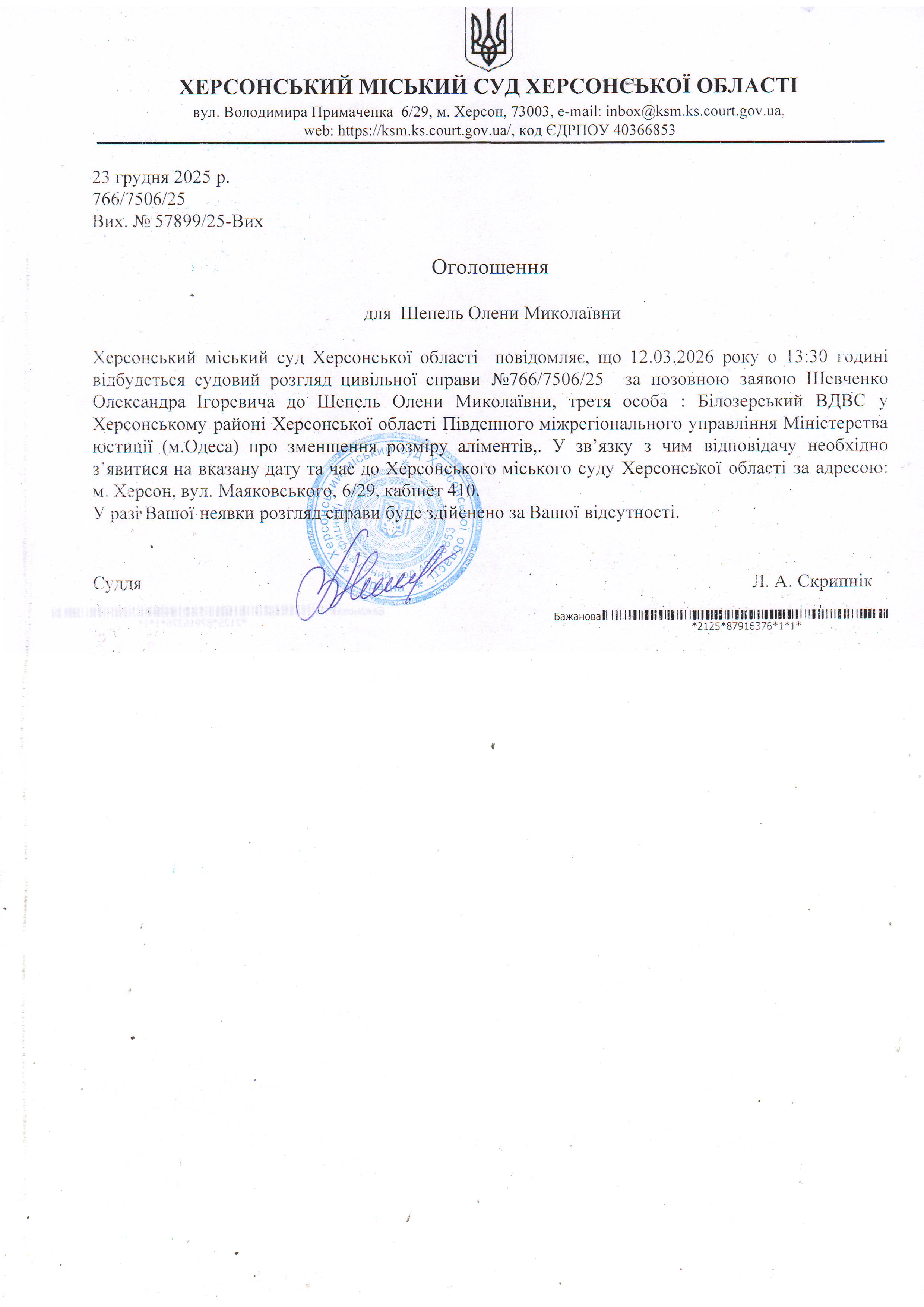 ОГОЛОШЕННЯ ПРО ВИКЛИК ДО СУДУ