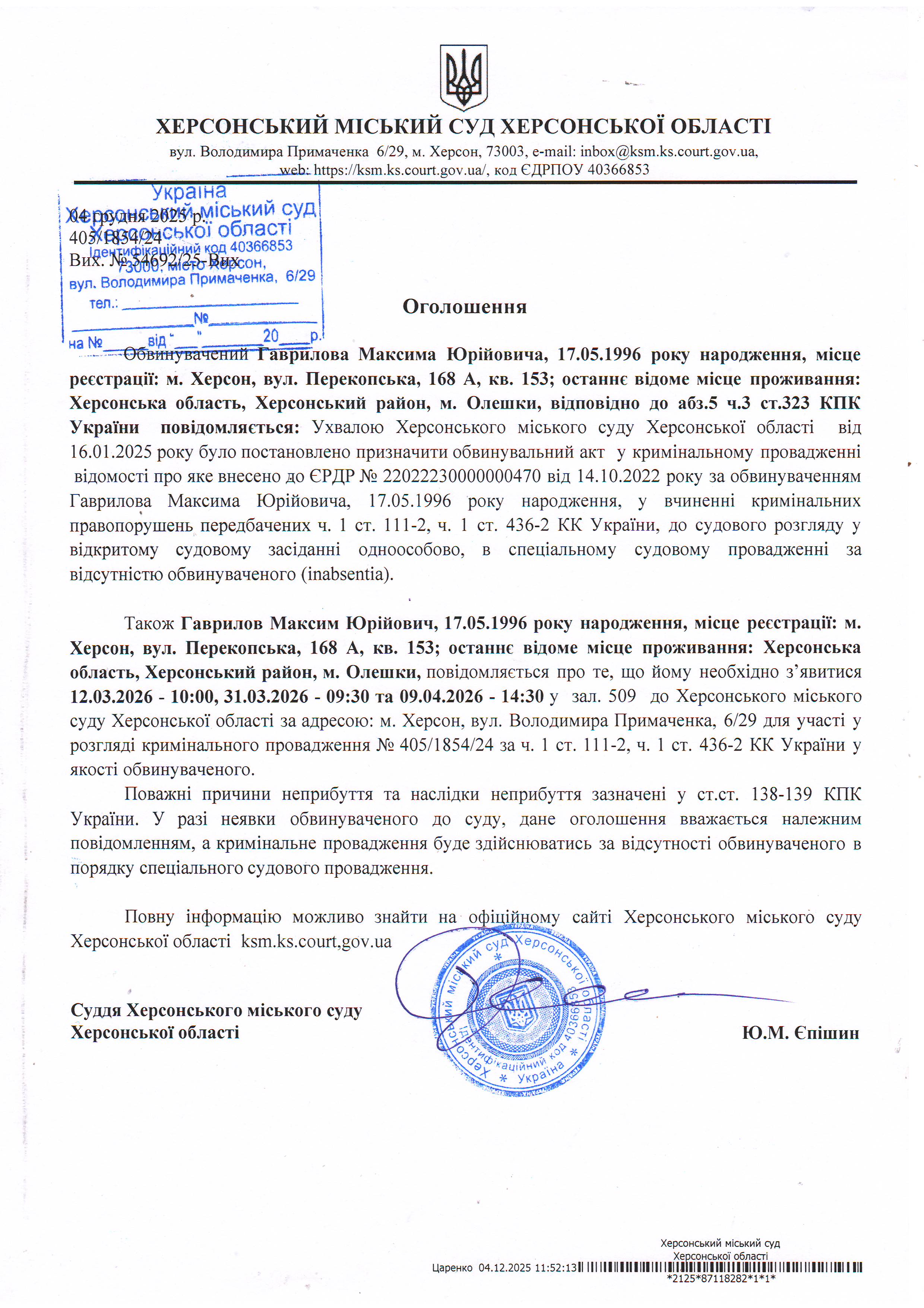 Оголошення про виклик особи в суд та повідомлення про судове рішення