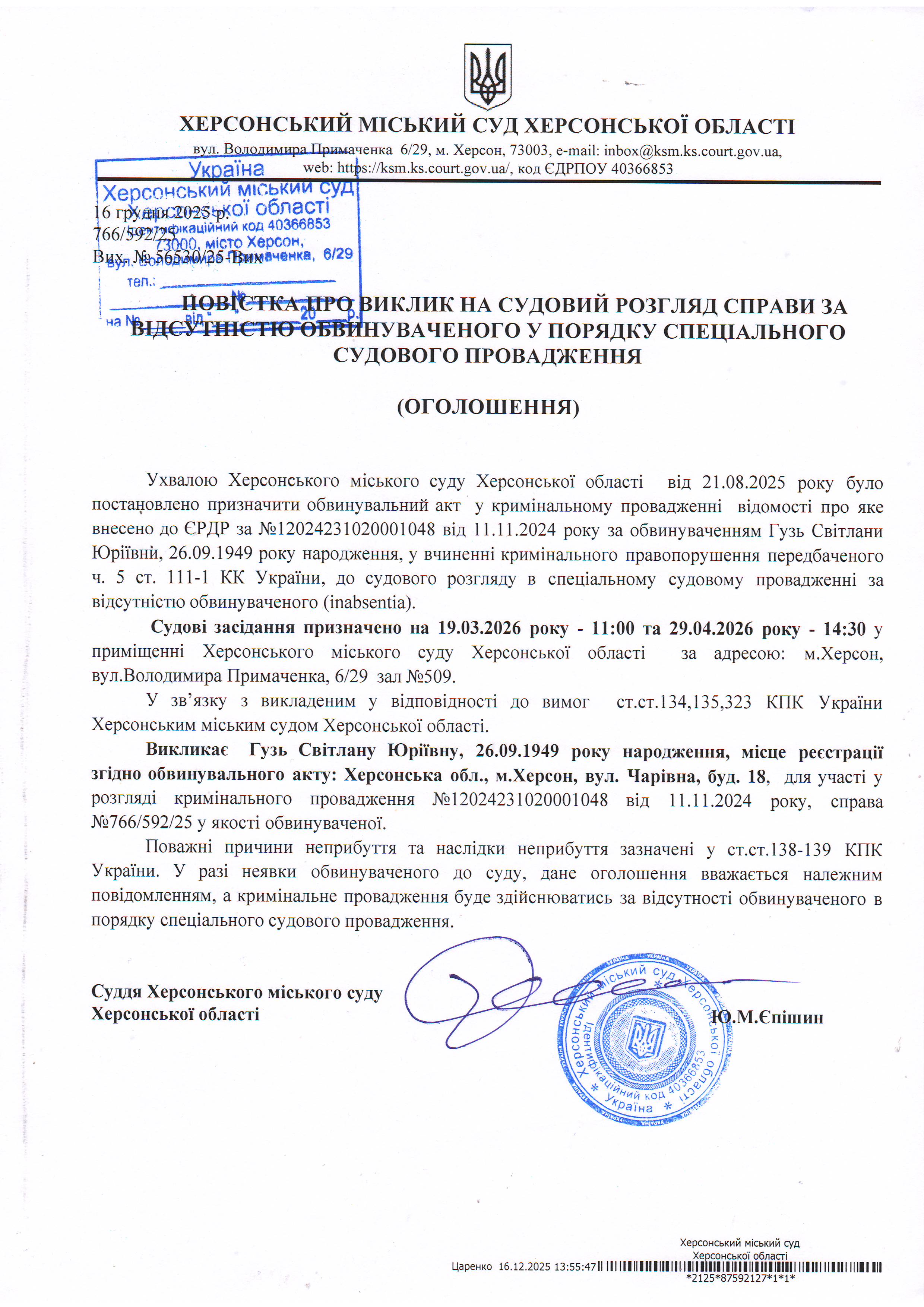 ОГОЛОШЕННЯ ПРО ВИКЛИК ДО СУДУ